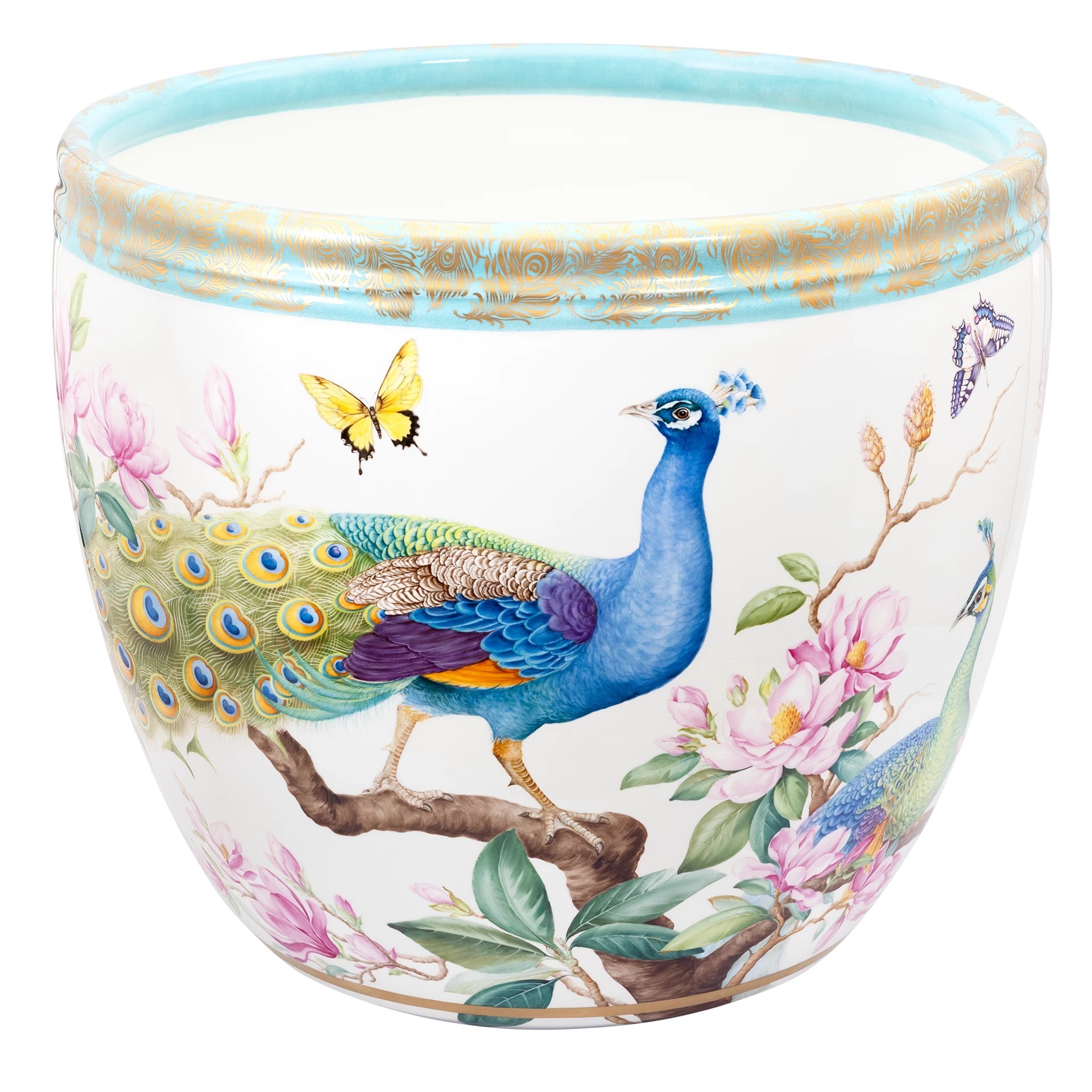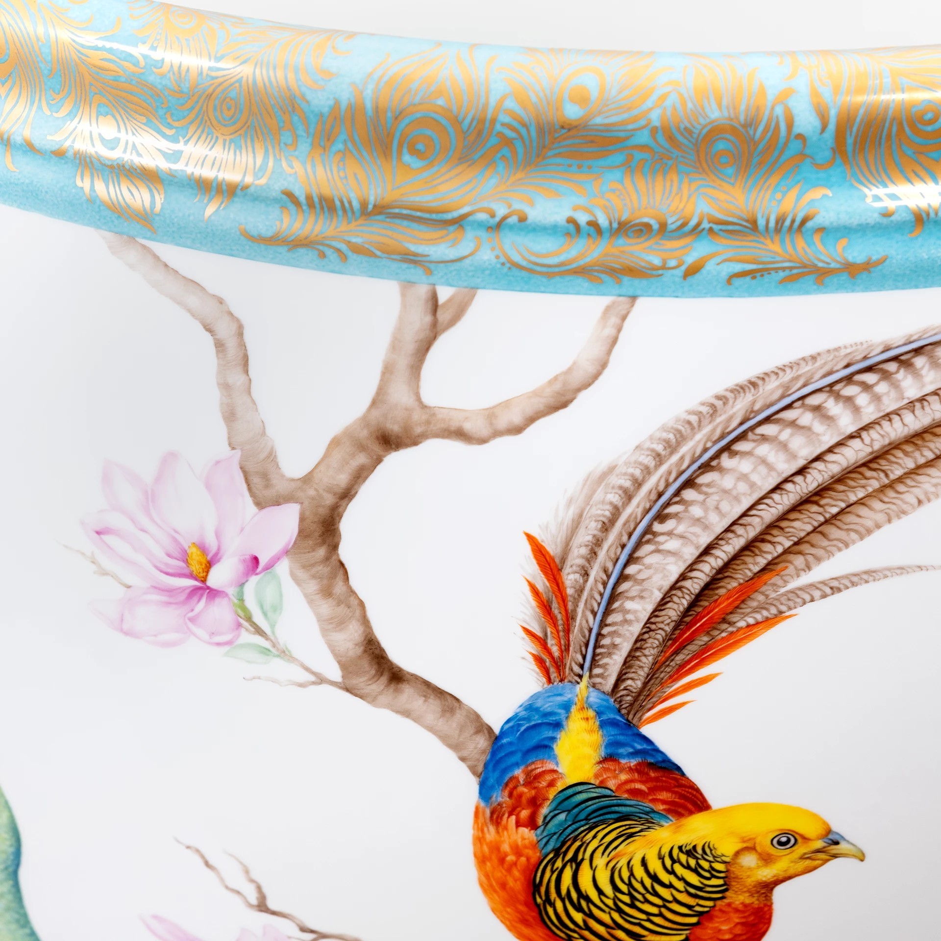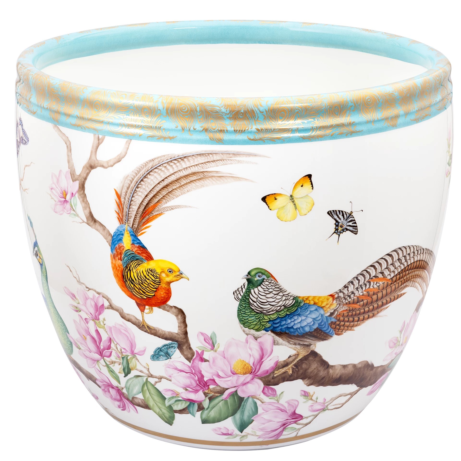 As early as the 1920s and 1930s, the MEISSEN manufactory produced large planters decorated with expansive landscape scenes in cobalt-blue underglaze. In today's new edition, the planter reveals itself in a richly colorful décor: a pair of magnificent peacocks and three different species of pheasants unfurl their iridescent plumage across the vessel's grand surface. A magnolia tree with tulip-shaped blossoms connects the birds into a harmonious composition. Finely detailed butterflies add a touch of lightness. The border, in radiant turquoise, is hand-stippled and adorned with golden peacock feathers - a brilliant flourish of utmost elegance.