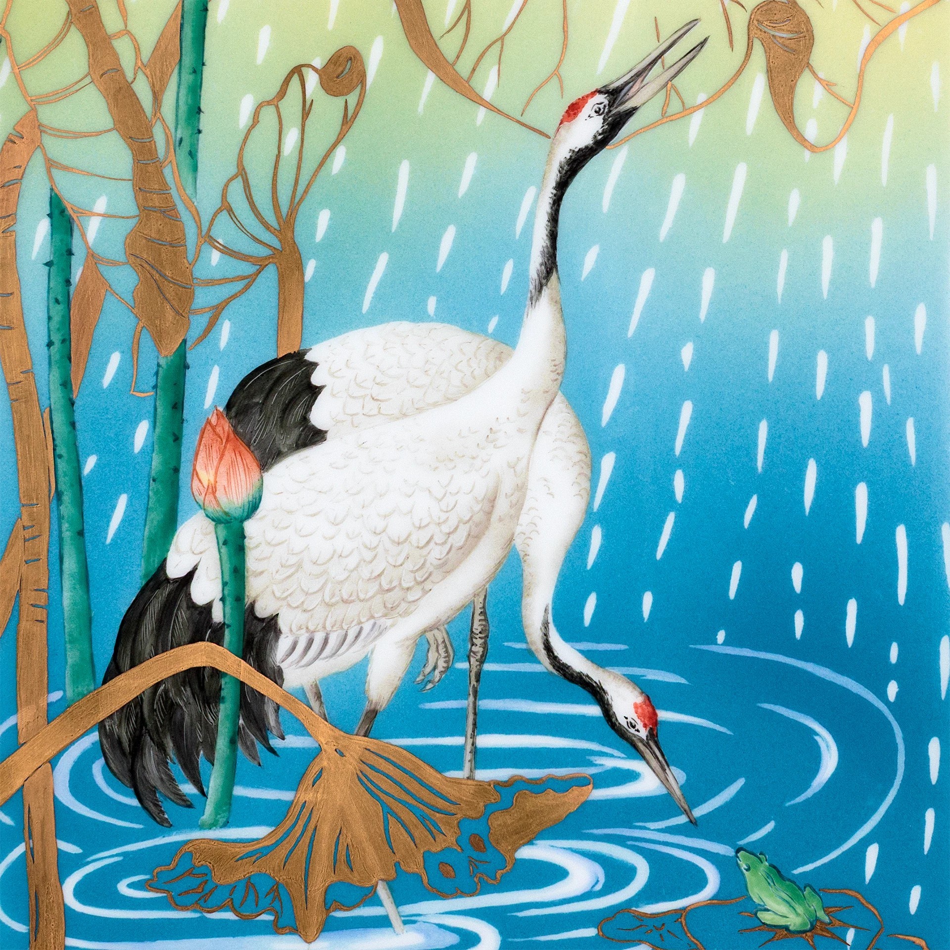 At the center of the summer scene stand two cranes. In traditional Chinese symbolism, summer represents abundance and vitality - radiant, vibrant, and blessed by the heavens. The days are filled with the fragrance of lotus blossoms, while the sun shines high in the sky. A warm summer rain brings refreshing energy to nature, as the pair of cranes dip their beaks and feet into the cooling water, where a small frog also frolics.
