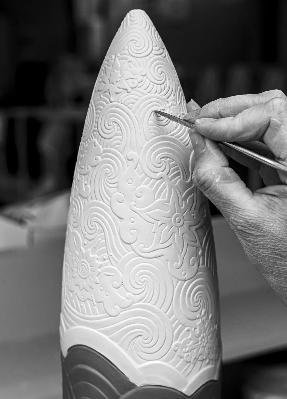Прозрачный фарфоровый абажур при включении излучает тёплый, притягательный свет, подчёркивая мастерство каждой резной детали. Синее основание светильника в сочетании с мягким свечением верхней части создаёт поразительный визуальный контраст, привнося ощущение чуда в любую обстановку.