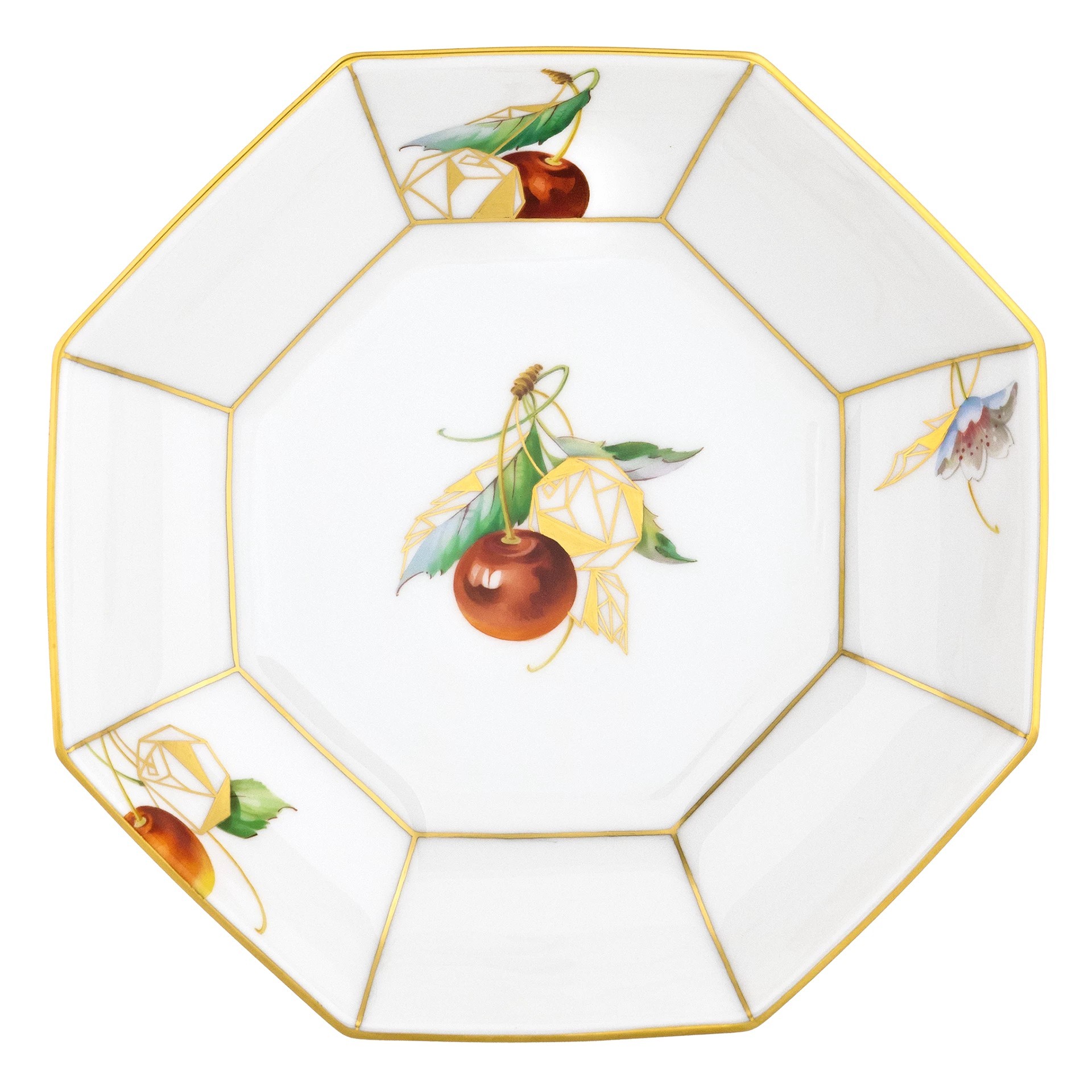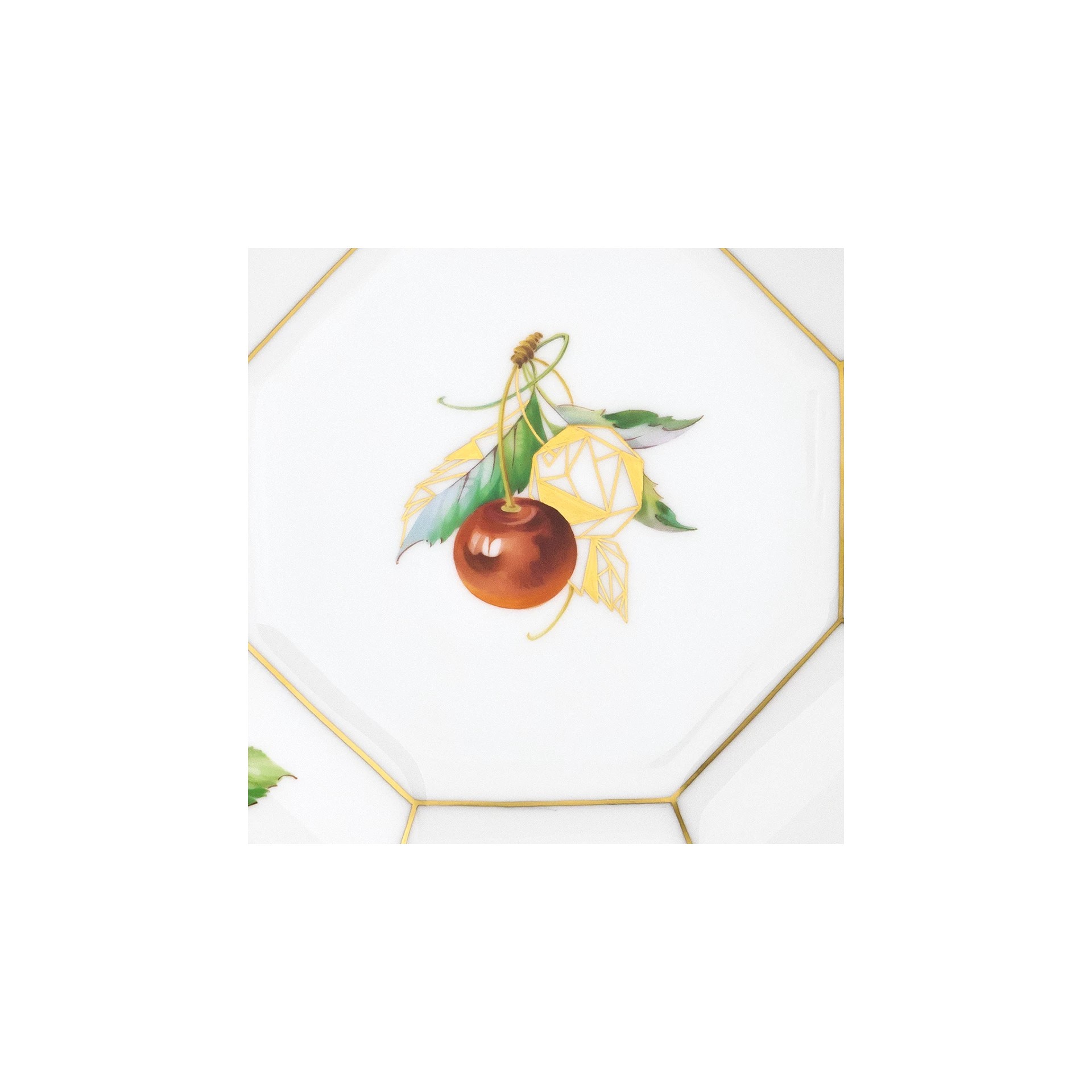Форма флакона, восходящая к раннему периоду существования мануфактуры, впервые использована для создания произведения, в котором натуралистические мотивы — в данном случае, ягоды белой смородины — соединяются с диаграммными элементами в позолоте. Яркие созревшие вишни на поверхности тарелки выглядят невероятно реалистично и объёмно, но их изображение намеренно уравновешено абстрактными формами в кубистическом стиле, выполненными широкими золотыми мазками. Некоторые участки сознательно оставлены без декора,демонстрируя невероятную белизну Майсенского фарфора.
