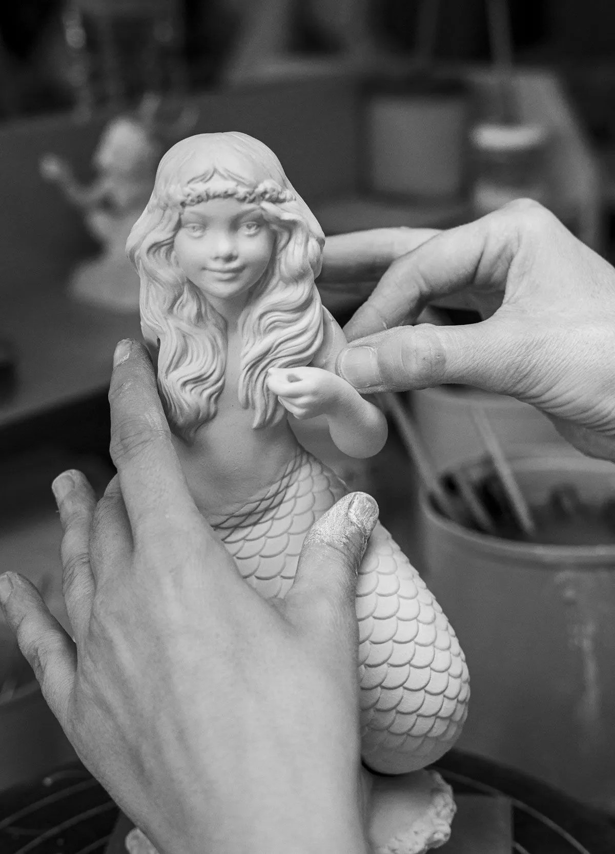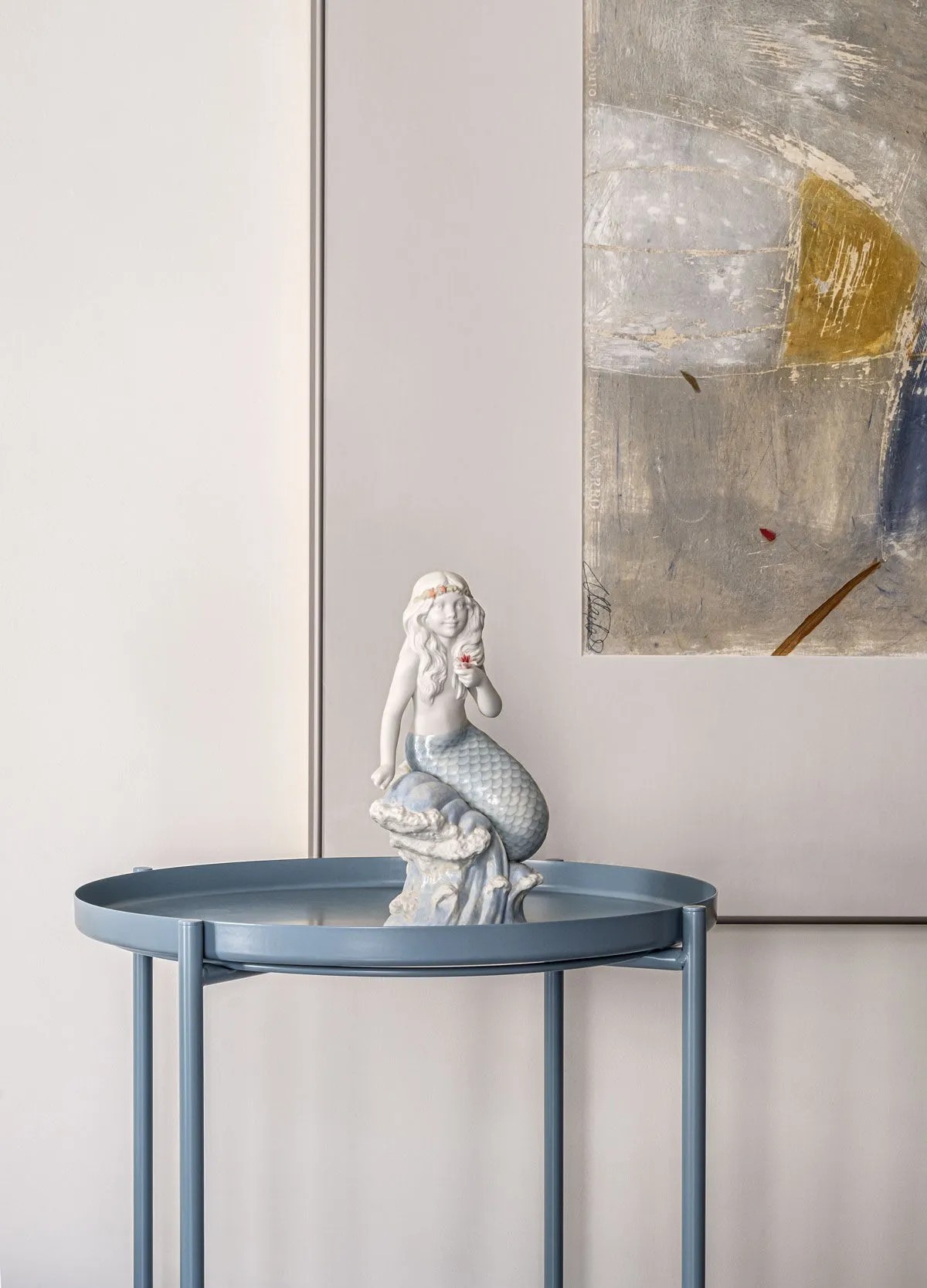 Сидя на вершине увенчанной пеной волны, русалочка держит нежный цветок, созданный лепесток за лепестком. Украшенный вручную гравированными чешуйками, ее хвост мерцает перламутровым, переливающимся серым покрытием, которое мягко отражает свет. Волна, окрашенная в эмалевые голубые тона, передает движение и жизненную силу, подчеркивая ее связь с ее домом в океане.