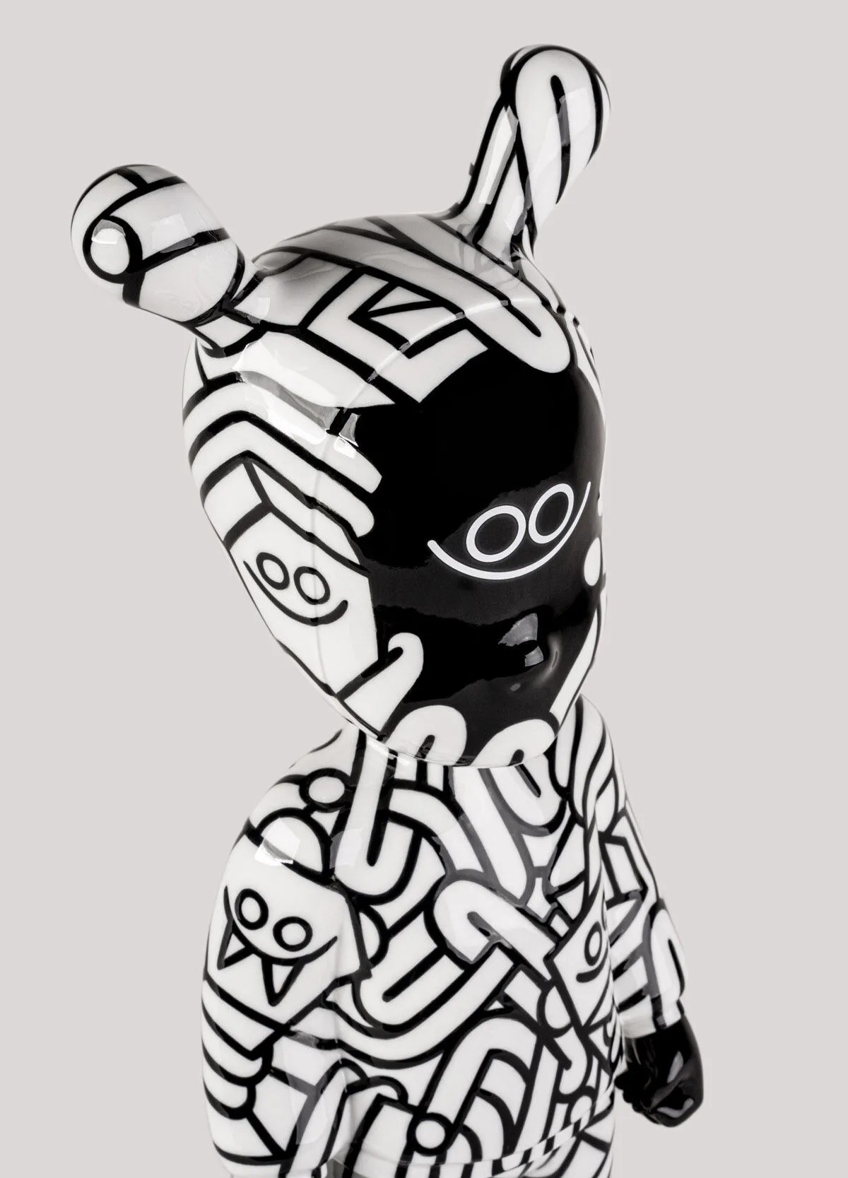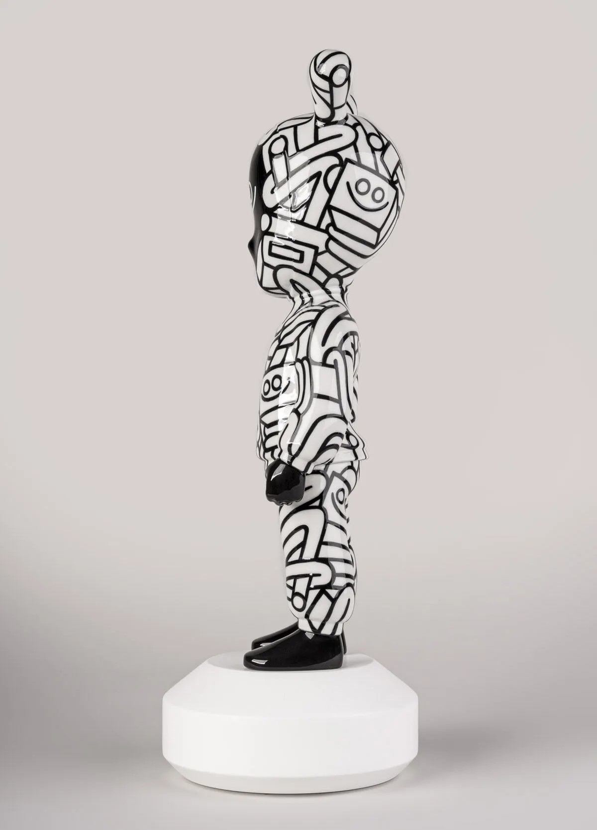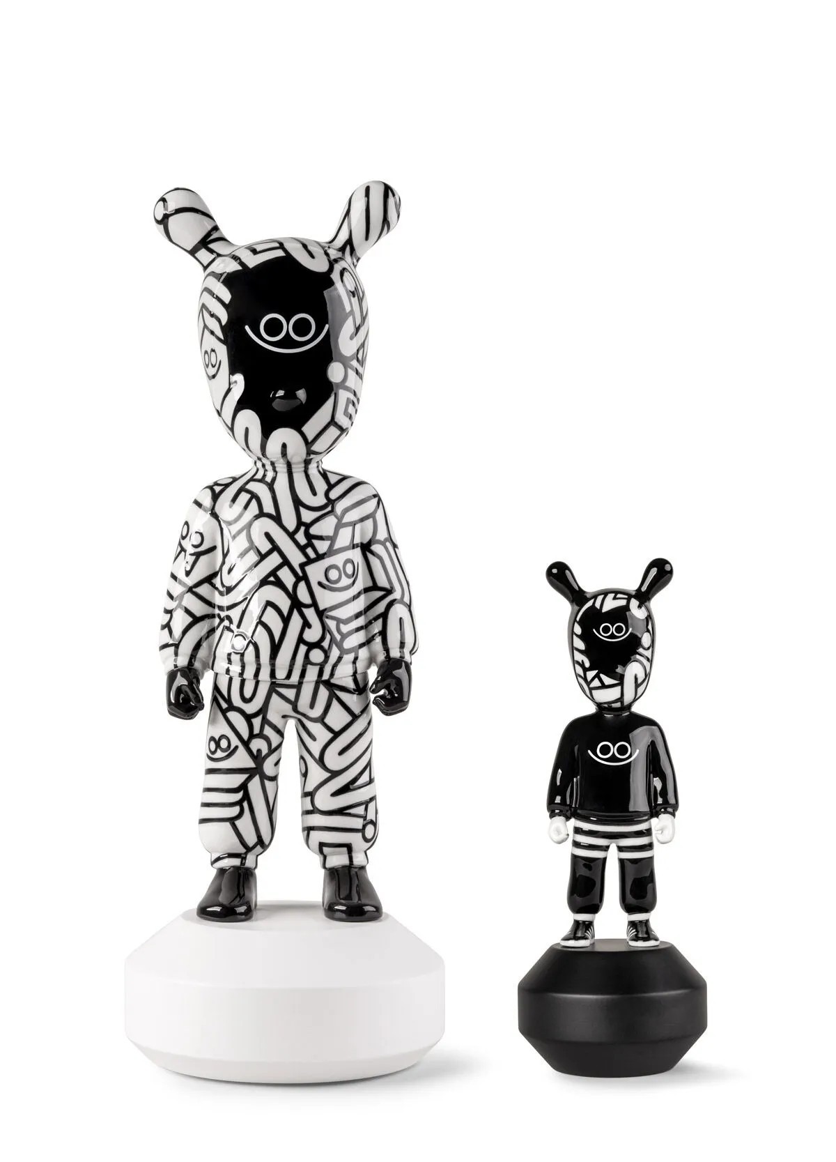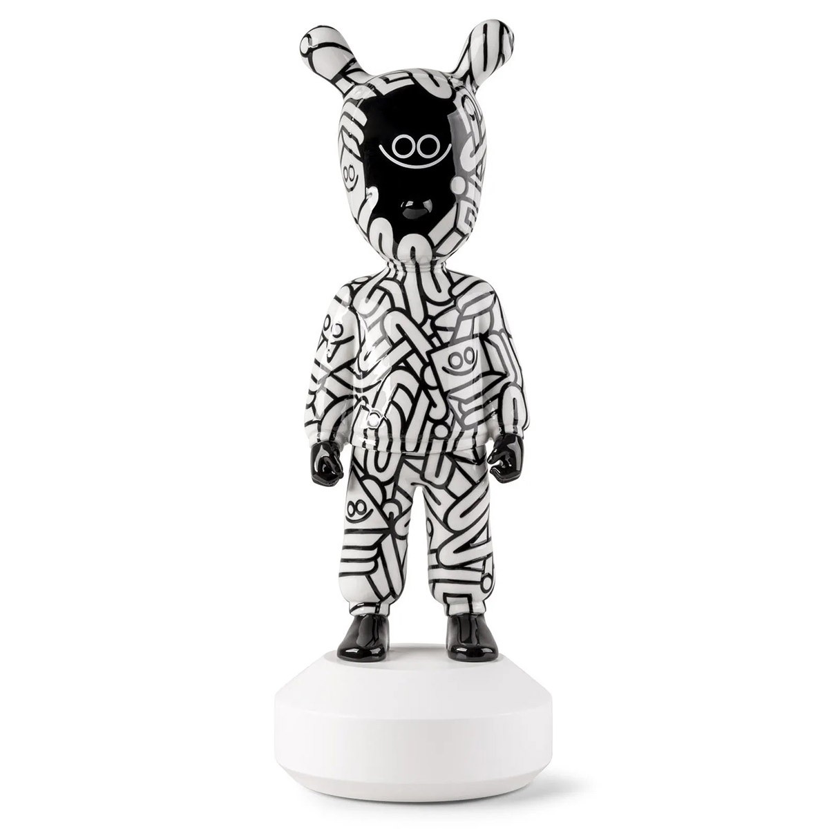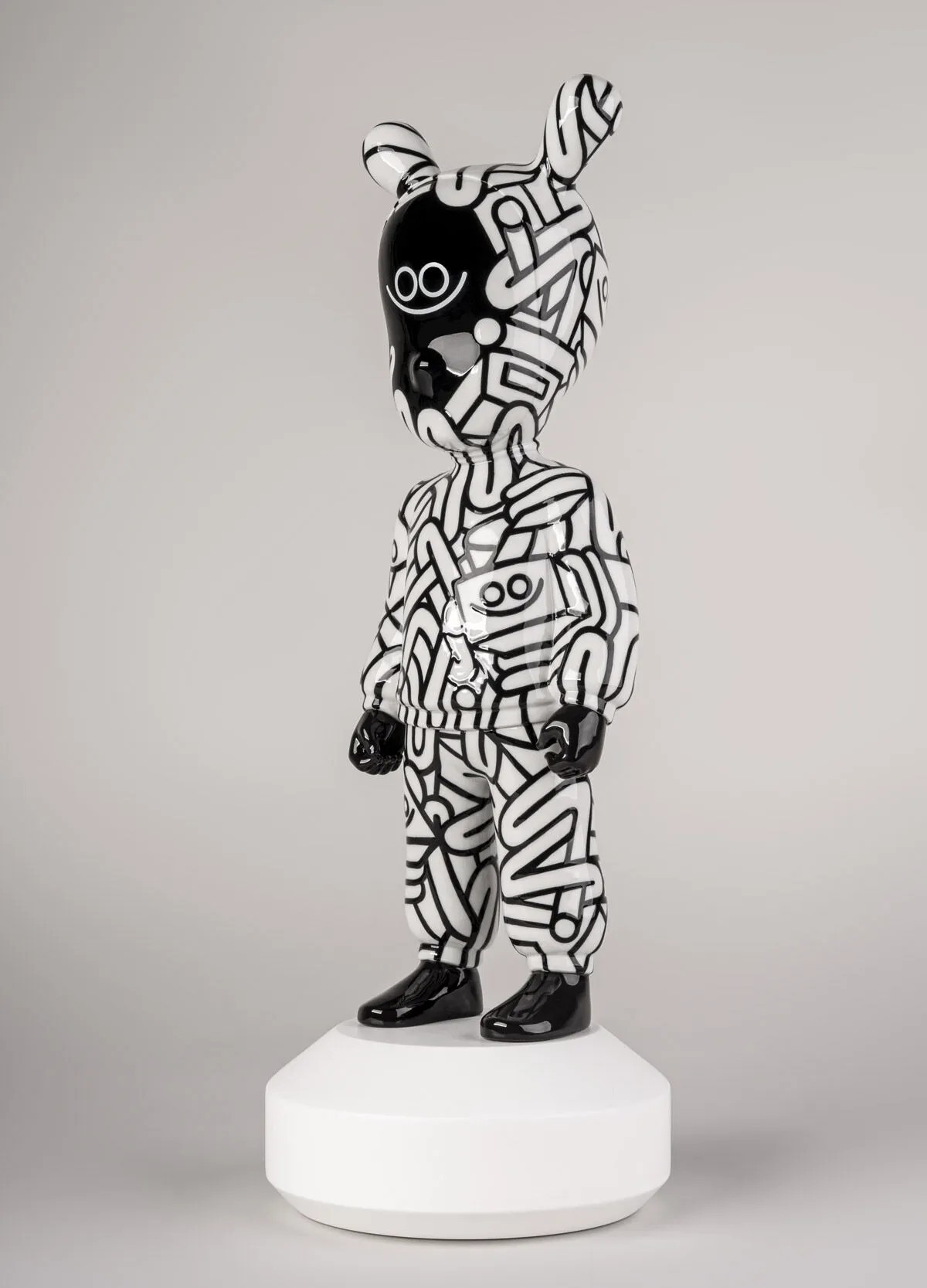 Эта лимитированная серия из 300 экземпляров демонстрирует творческий почерк Хуана Диаса-Фаэса, художника, монументалиста и иллюстратора, известного своим дружелюбным и доступным визуальным языком. Изготовленная из фарфора и декорированная вручную, она украшена сложным черно-белым линейным узором, покрывающим всю поверхность, превращая силуэт «Гостя» в трёхмерное полотно для самых узнаваемых образов художника.