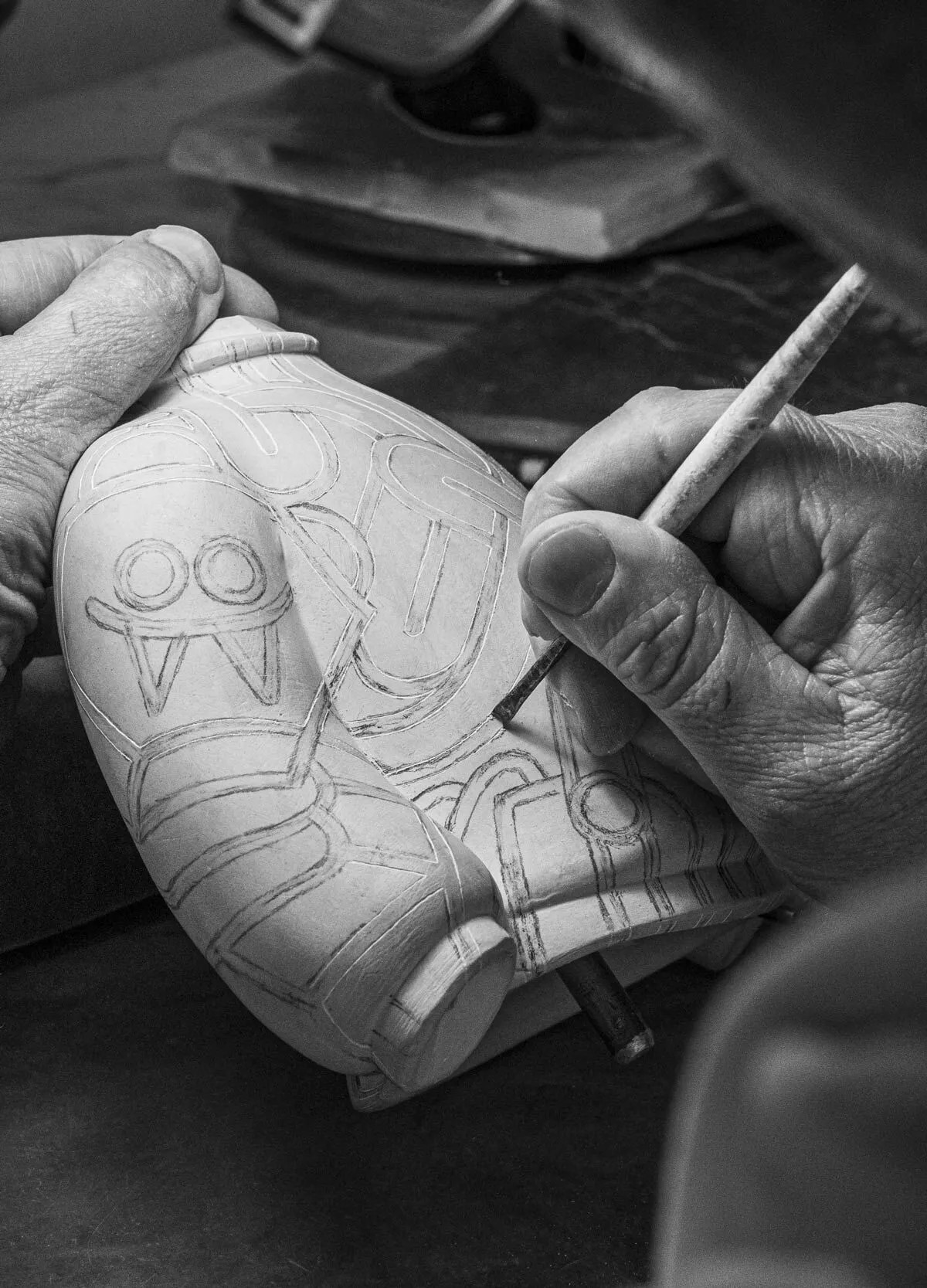 Благодаря геометрическим формам, плавным линиям и закруглённым лицам Диас-Фаэс создаёт гипнотический и динамичный эффект, который словно движется по всему изделию. В результате получился графический пейзаж, привлекающий внимание со всех сторон, сочетающий в себе ремесленную технику и визуальную силу в ярко выраженной индивидуальности.