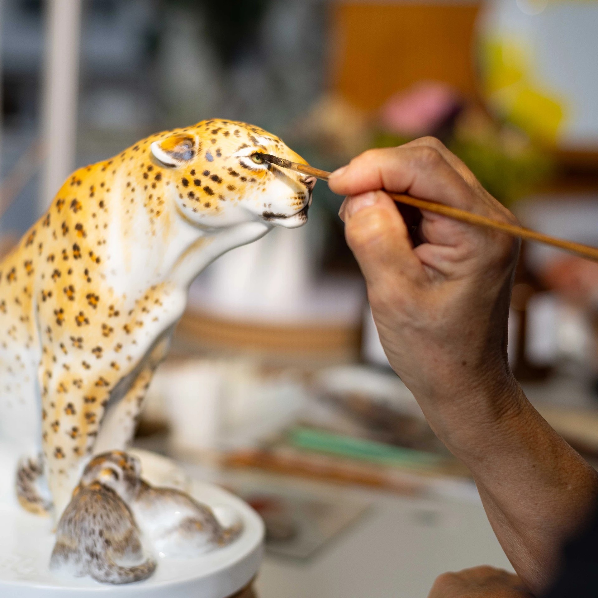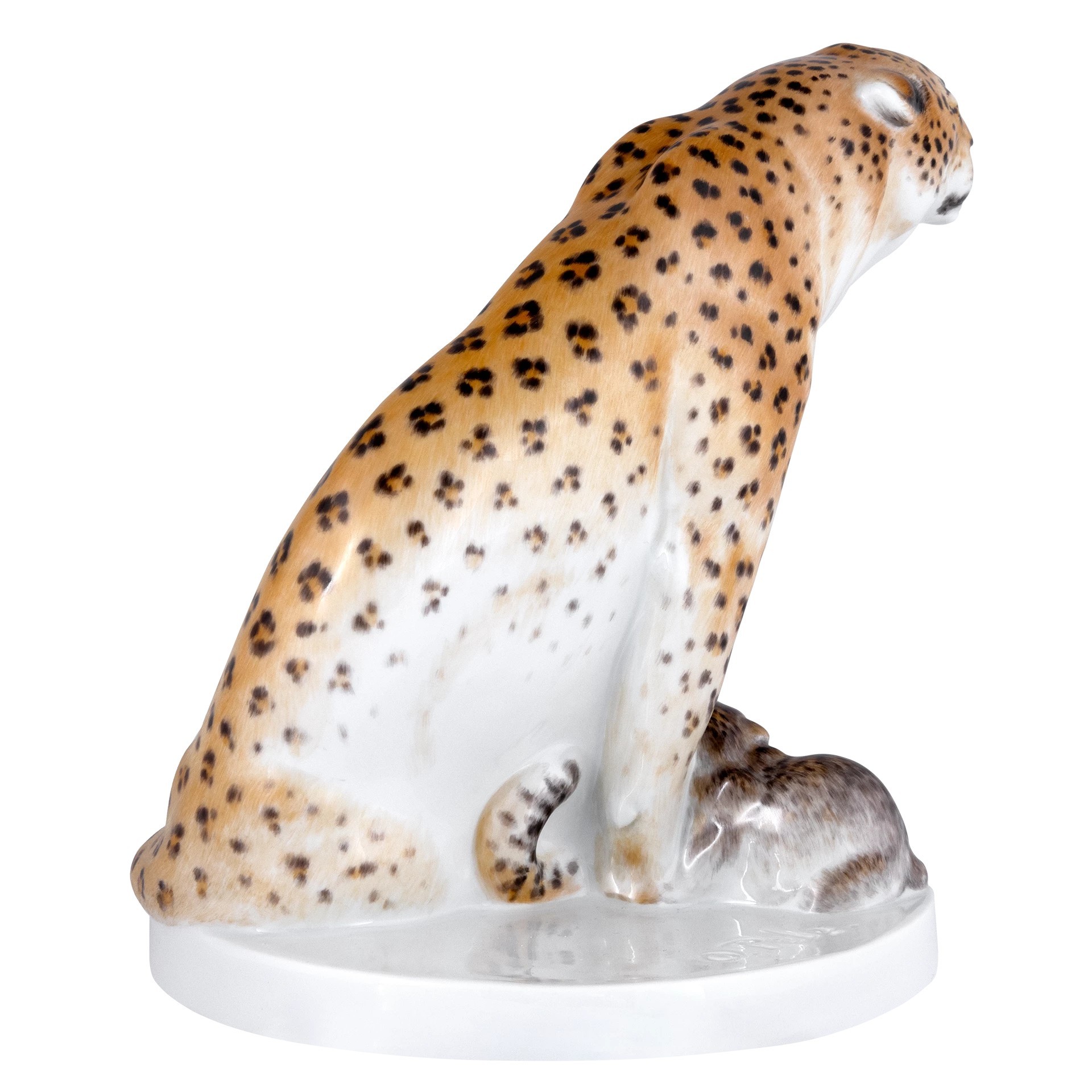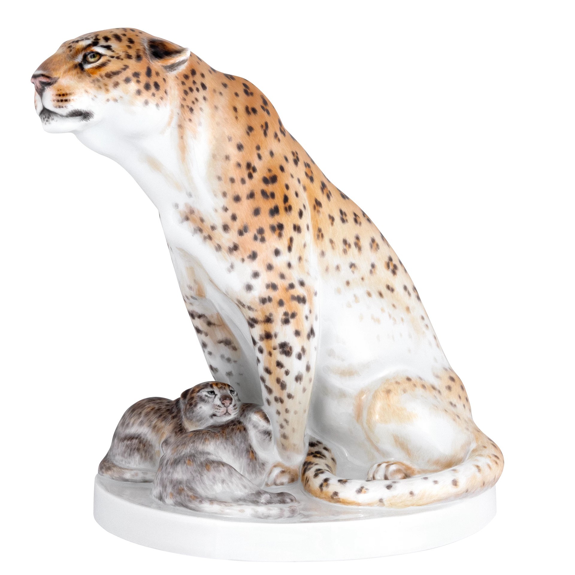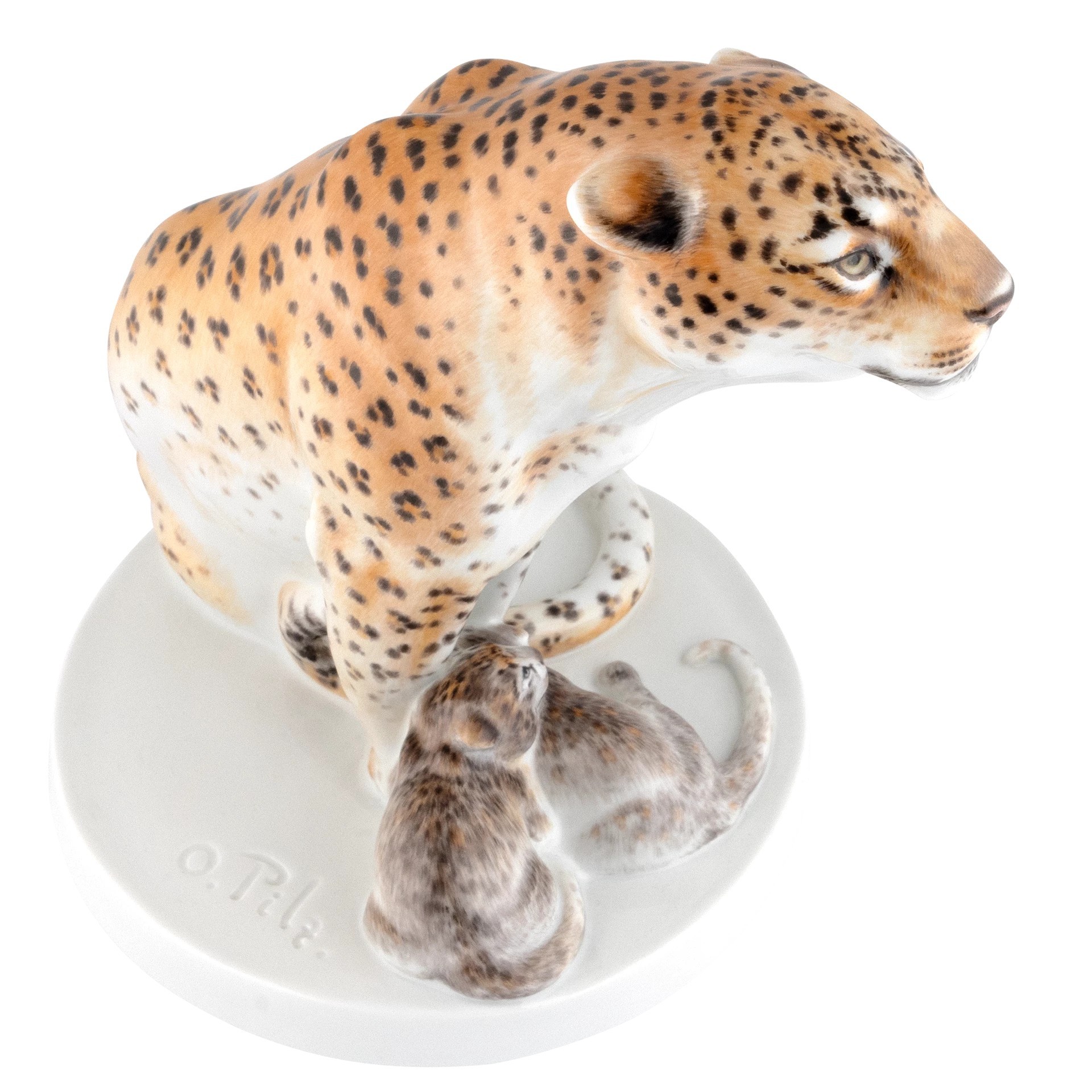 Мануфактура Meissen воссоздала эту фигурку в честь 150-летия со дня рождения Отто Пильца. Мейсенский скульптор был известен своей наблюдательностью. Он изучал животных в зоопарках и дикой природе, запоминая каждый нюанс их мимики и повадок, прежде чем создавать их фигуры из фарфора. Его талант к реалистичному изображению можно увидеть и в этой выразительной фарфоровой скульптуре, отражающей тесную связь и заботу матери по отношению к своим детям: леопард вытягивает голову вперед, настороженно защищая своих детёнышей. Два малыша прижимаются к ней, ища опору в сильных лапах матери. Пильц, обладая чутким взглядом на движение и экспрессию, запечатлевает тесную связь матери и детеныша.