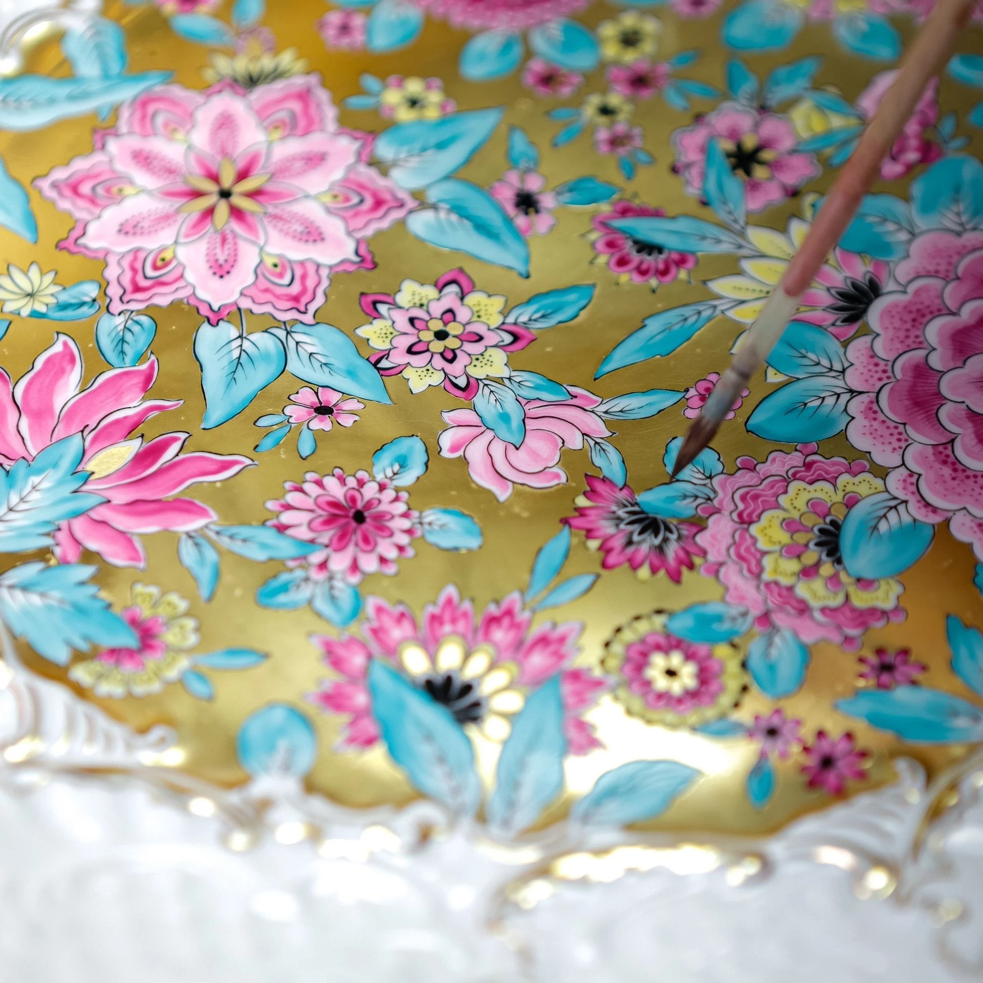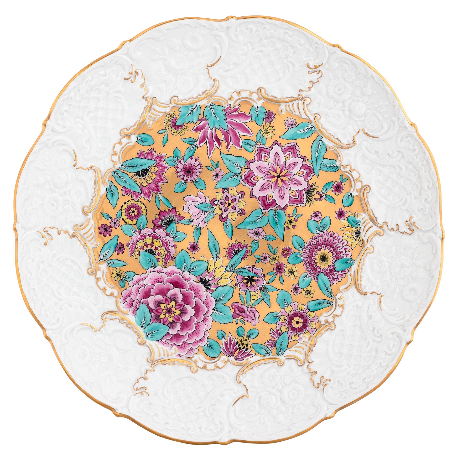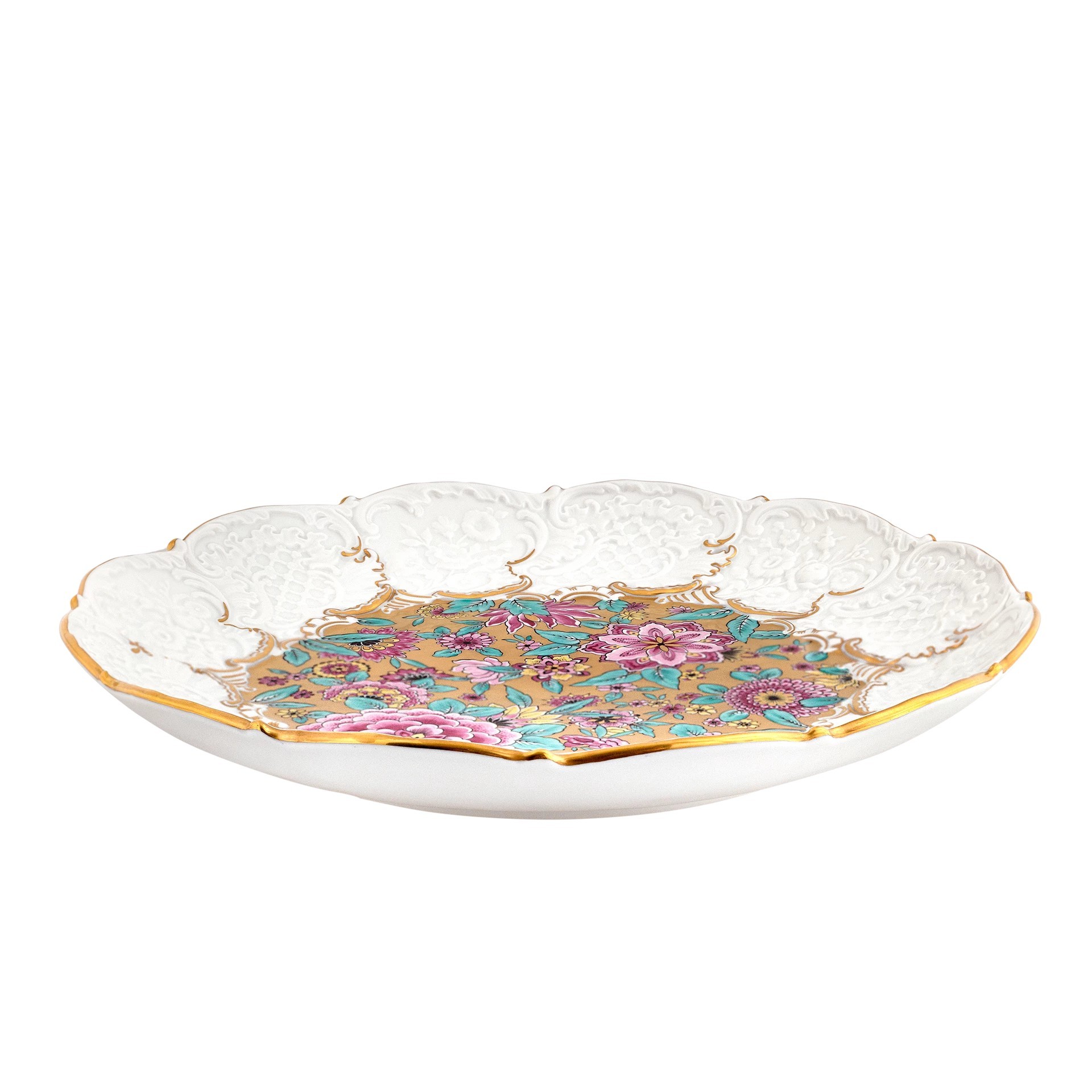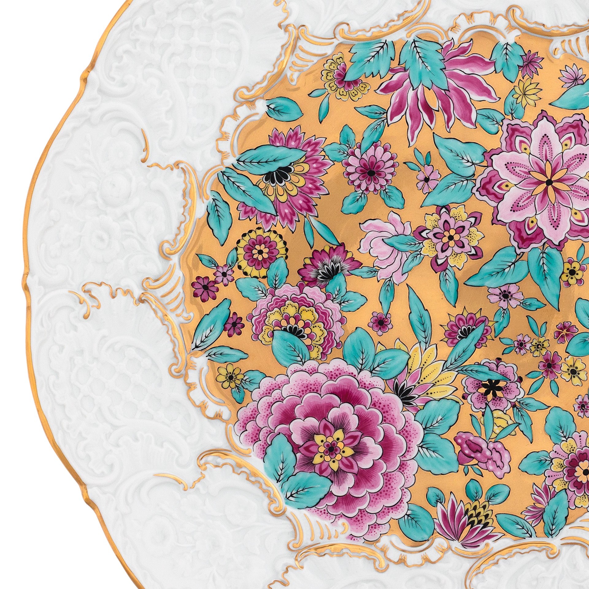 Рельефная проработка этой тарелки является прекрасным примером мейсенского ремесленного мастерства XIX века. В этом переиздании рельефная часть изделия оставлена белой, чтобы подчеркнуть детализацию орнамента. Художница по фарфору Анетт Гернер использовала тончайшую форму восточной росписи. Во времена Августа Сильного всё, что находилось восточнее Индии, называлось India Meridionalis или India Superior, и поэтому любой фарфор, произведённый на мануфактуре по образцам с цветочными или мифологическими животными узорами из Китая или Японии, именовался с пометкой «indianisch». То есть перед вами один из наиболее узнаваемых стилей росписи на мейсенском мануфактуре – так называемая «индийская цветочная живопись». Дополнительную роскошь создаёт тонкое золочение, плавно проходящее по рельефному орнаменту и обрамляющее центральный мотив.
