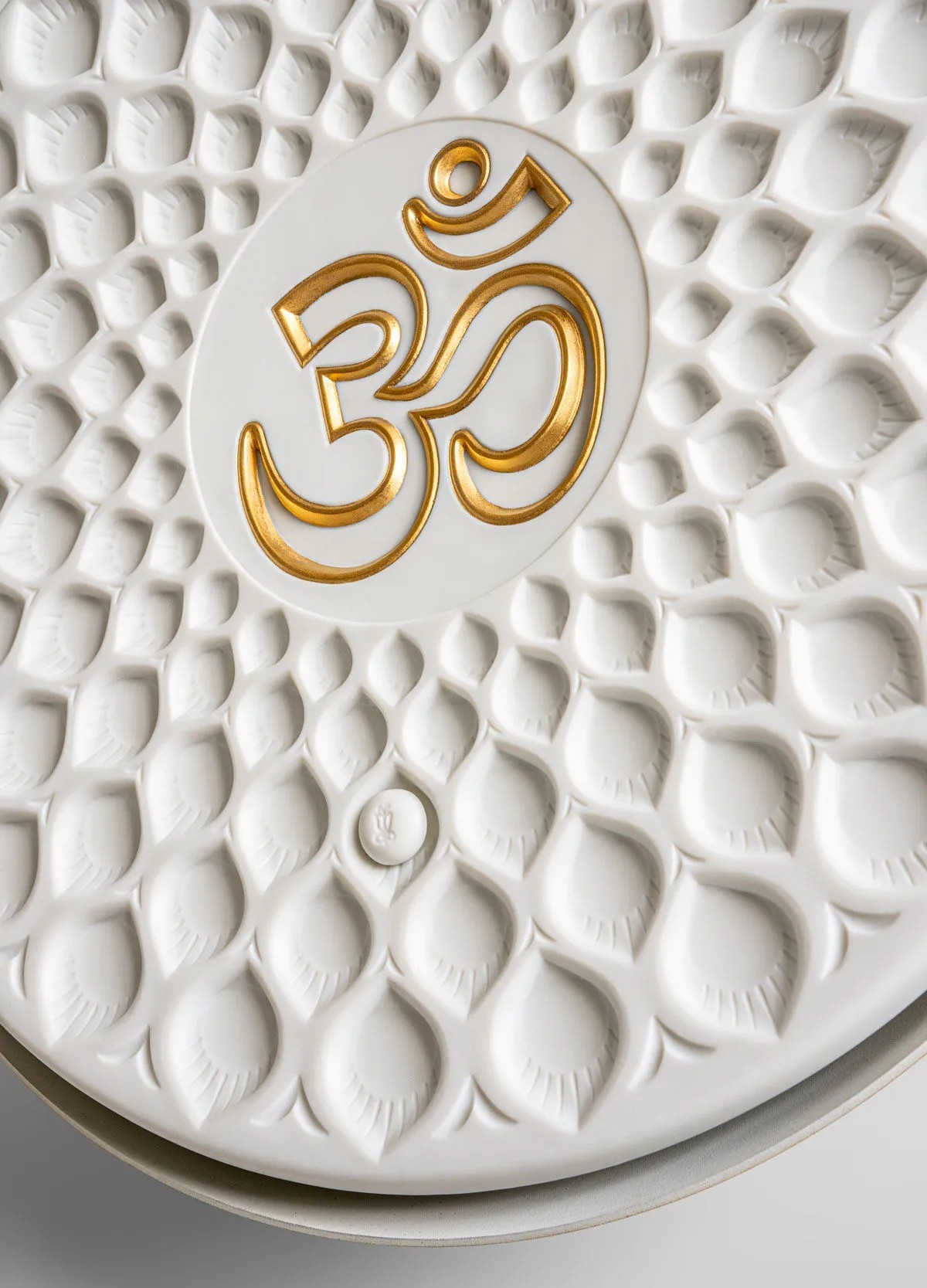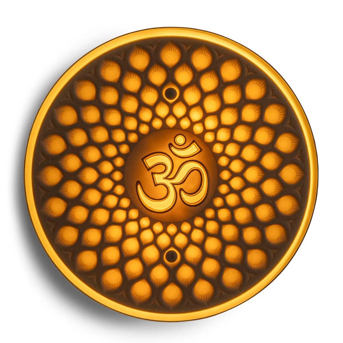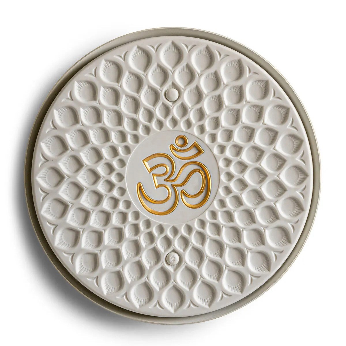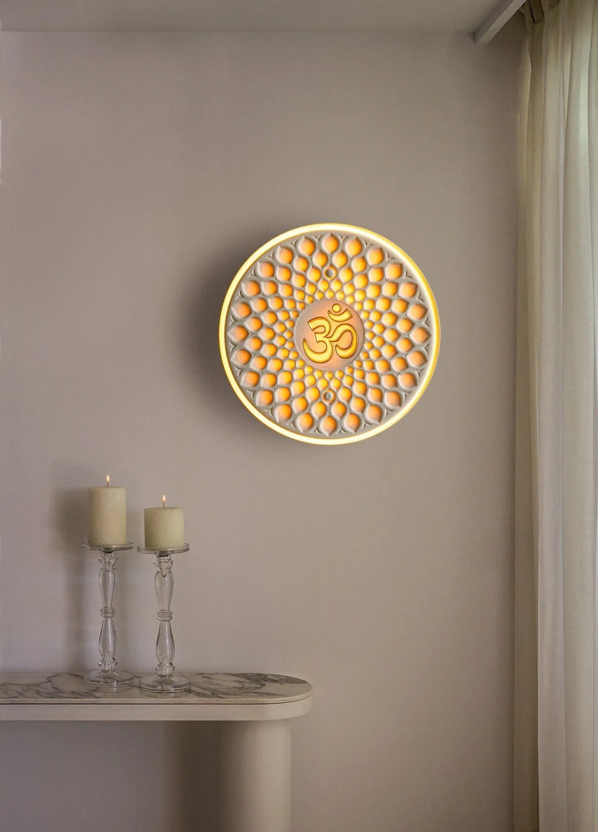 Ом - священный слог, символизирующий единение с высшим началом, соединение физического и духовного. Он является основной мантрой в дхармических религиях, таких как индуизм и буддизм. Этот трансцендентный символ, звук, из которого возникают все остальные, представлен в золотом блеске в центре настенного светильника. Он выполнен из полупрозрачного белого матового фарфора, на котором вручную выгравирован детальный геометрический орнамент вокруг слога Ом. Благодаря полупрозрачности фарфора, при освещении лампа излучает теплое сияние и подчеркивает геометрический орнамент на поверхности.