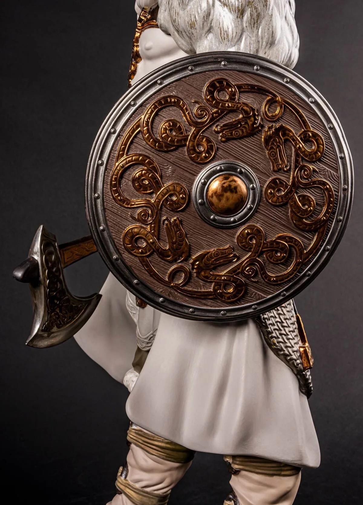 Эта матово-белая фарфоровая скульптура передает сущность Одина, величественного царя богов в скандинавской мифологии, готового сражаться с силами хаоса, угрожающими миру.