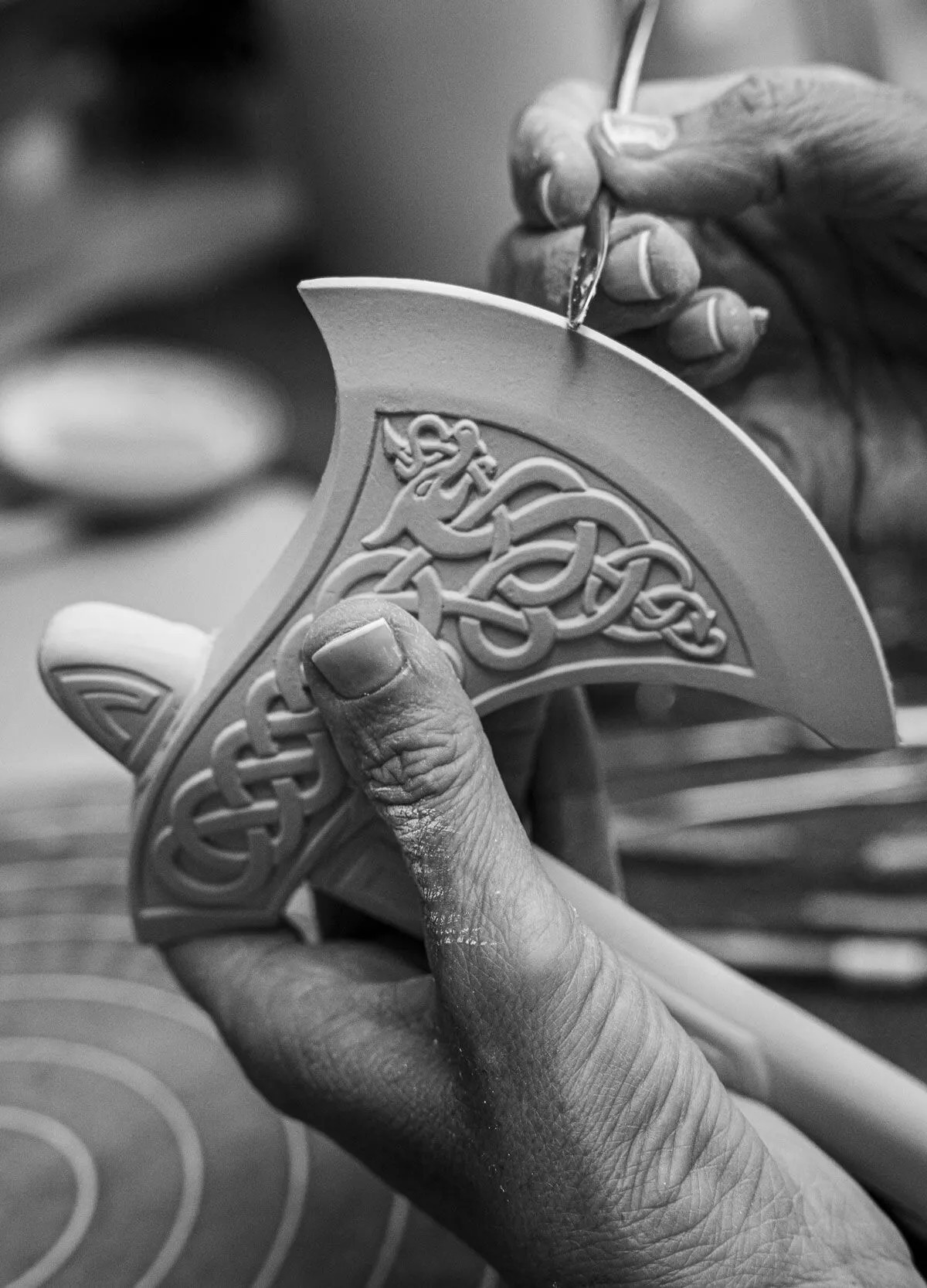 Каждая деталь этого изделия была тщательно выполнена. От моделирования анатомии до орнаментации и нанесения металлического блеска, это творение передает повышенный реализм, демонстрируя непревзойденный контроль над скульптурными и декоративными приемами в фарфоре.
