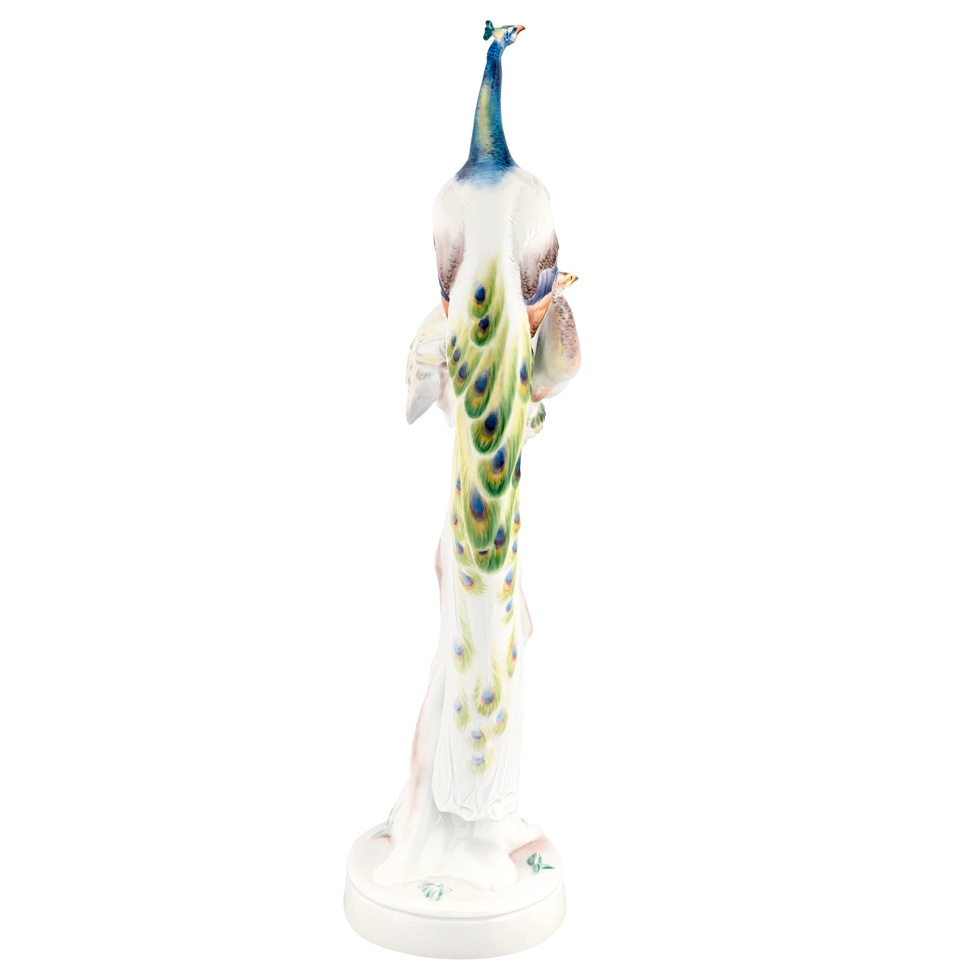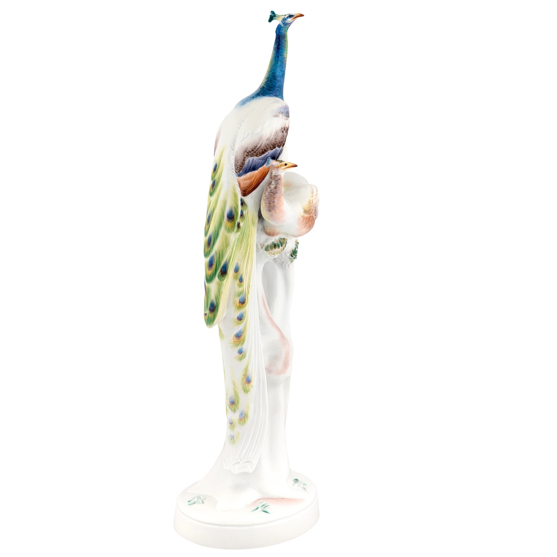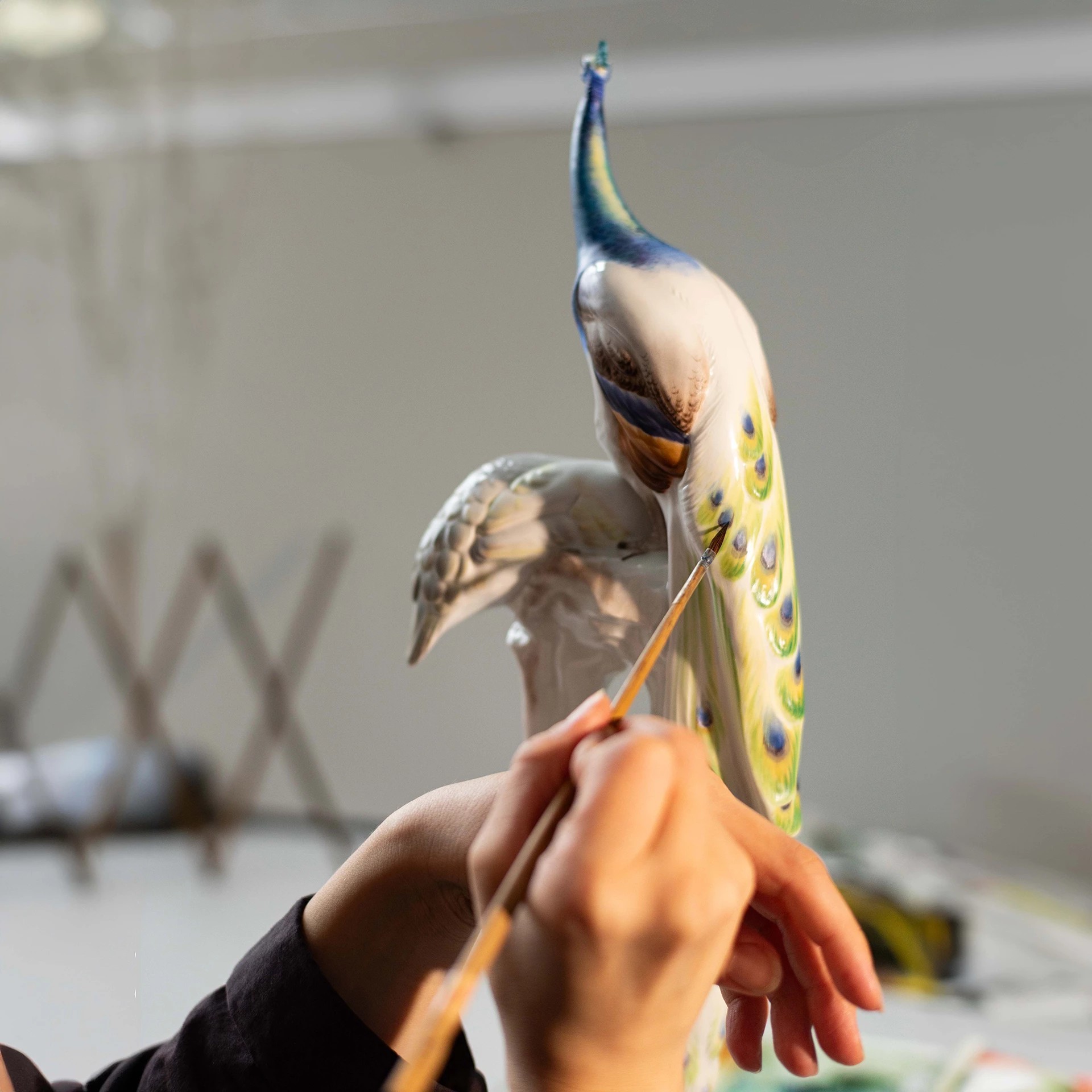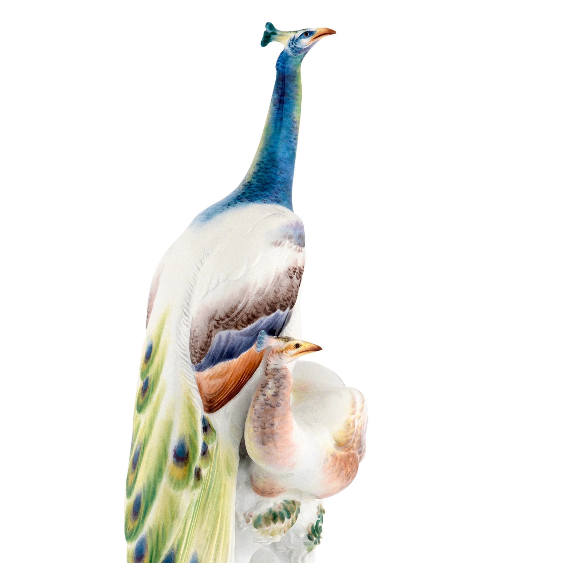 Мануфактура отмечает 150-летие со дня рождения Пауля Вальтера, переиздавая его скульптурную группу «Павлин и пава» в сдержанной лаконичной живописной манере его эпохи. Павлин – символ красоты, гордости и духовного преображения – во многих культурах он олицетворяет бессмертие и мудрость. Есть что-то почти величественное в том, как птица вытягивает свою великолепную синюю шею вверх, сидя на ветке. Длинные перья его хвоста красивого нежного зеленого цвета оперения свисают вниз. Рядом с павлином в его ногах сидит гораздо менее яркая скромная пава, как это часто бывает в мире животных и птиц.