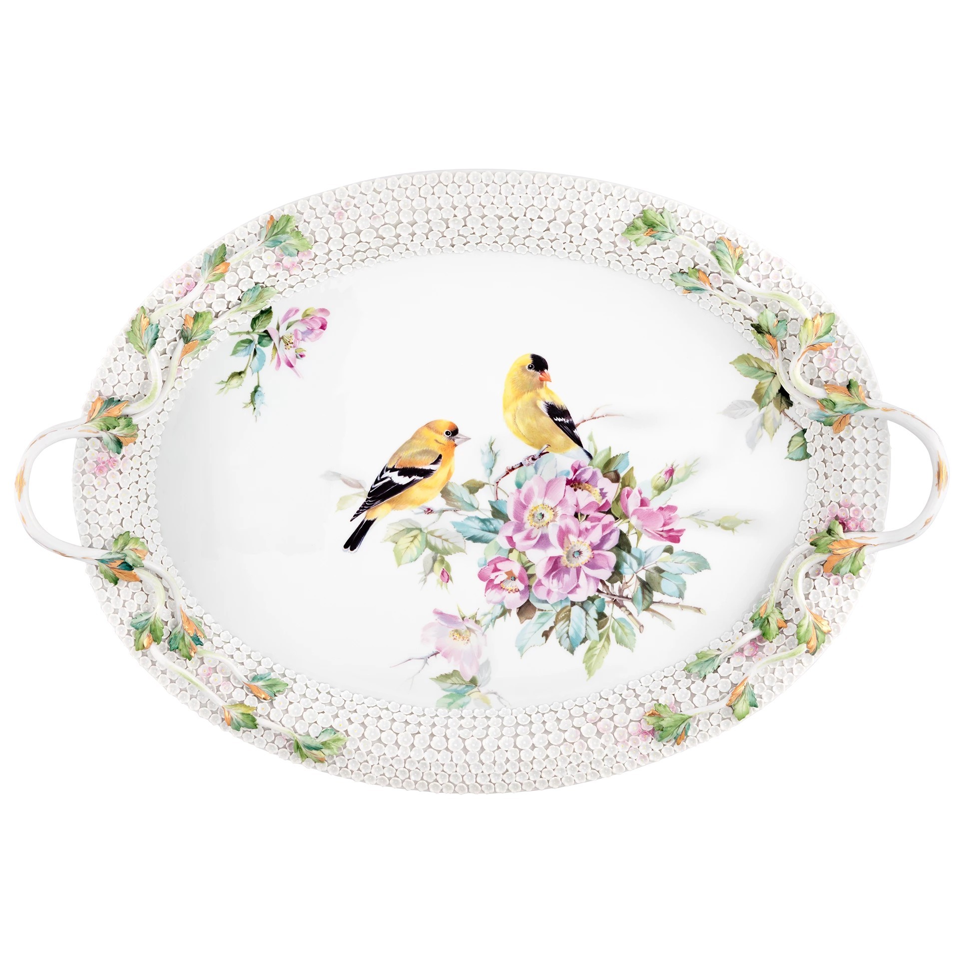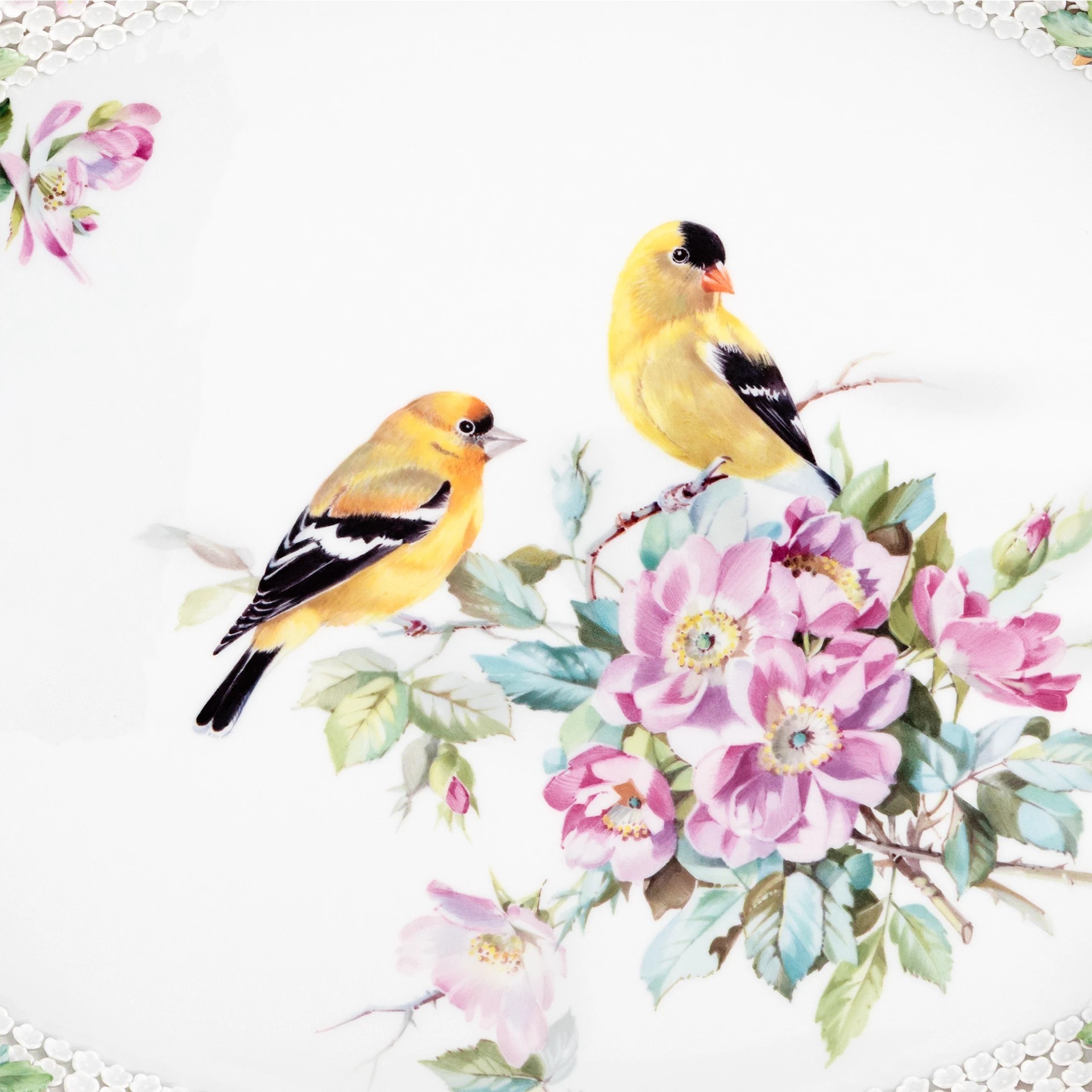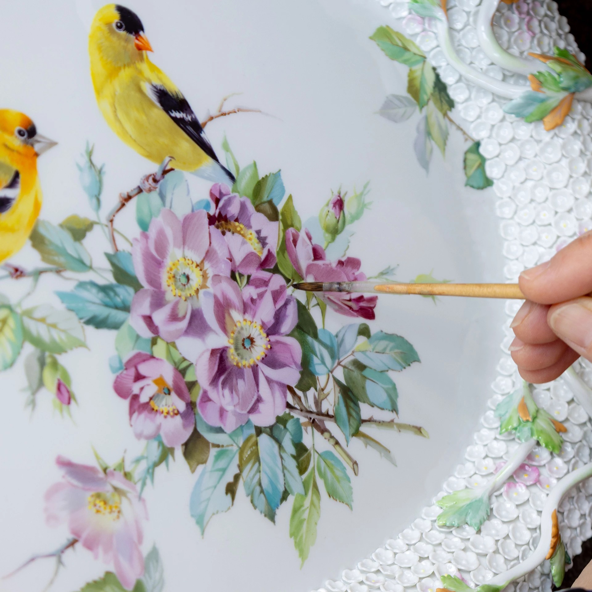 Данный поднос в коллекции 2026 года датируется 1821 годом. Каждый из 1200 цветов и ветвей с листьями выполнены вручную, как и во времена Кендлера, и прикреплены к подносу специальным острым инструментом, похожим на нож. Они служат пышным, скульптурным обрамлением для натуралистической росписи сцены типичной для фарфоровой живописи того времени: два щегла сидят на букете диких роз. Мягкая цветовая палитра подчеркивает пастельные тона цветочных элементов и позволяет подчеркнуть и сделать акцент на ярко-желтой окраске двух щеглов.