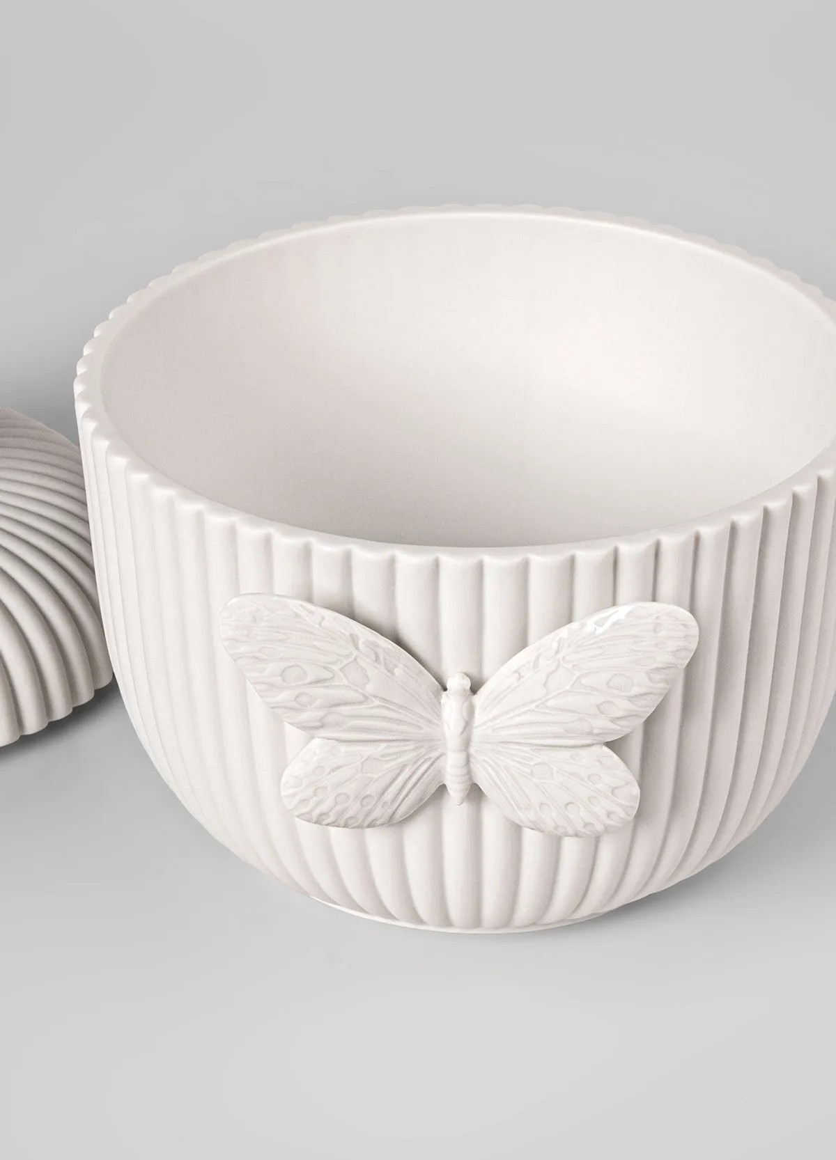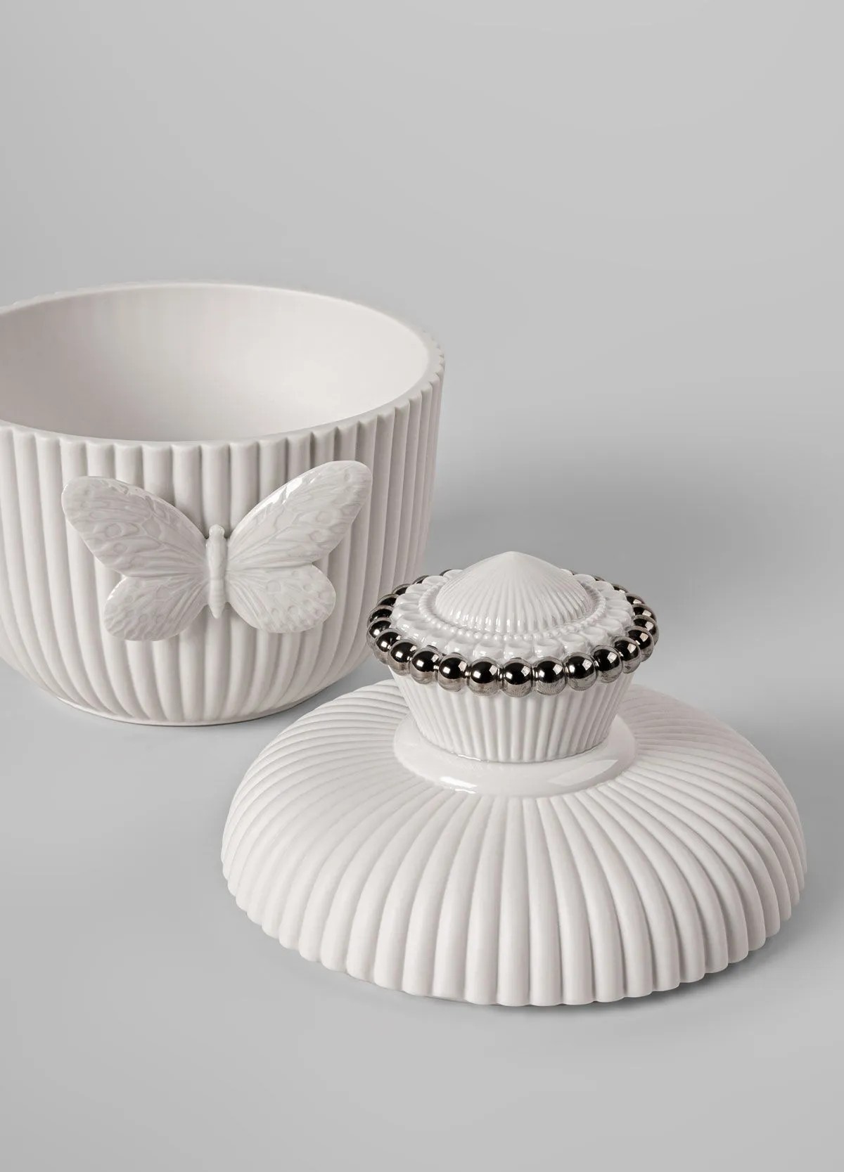 Шкатулка для украшений «Леди Удача», созданная Ольгой Ханоно, — уникальное изделие, сочетающее в себе матовый белый фарфор, волнистые формы и изящную бабочку, расписанную вручную. Этот символ удачи и преображения придаёт особый смысл изделию, сочетающему традиции и современный дизайн.
