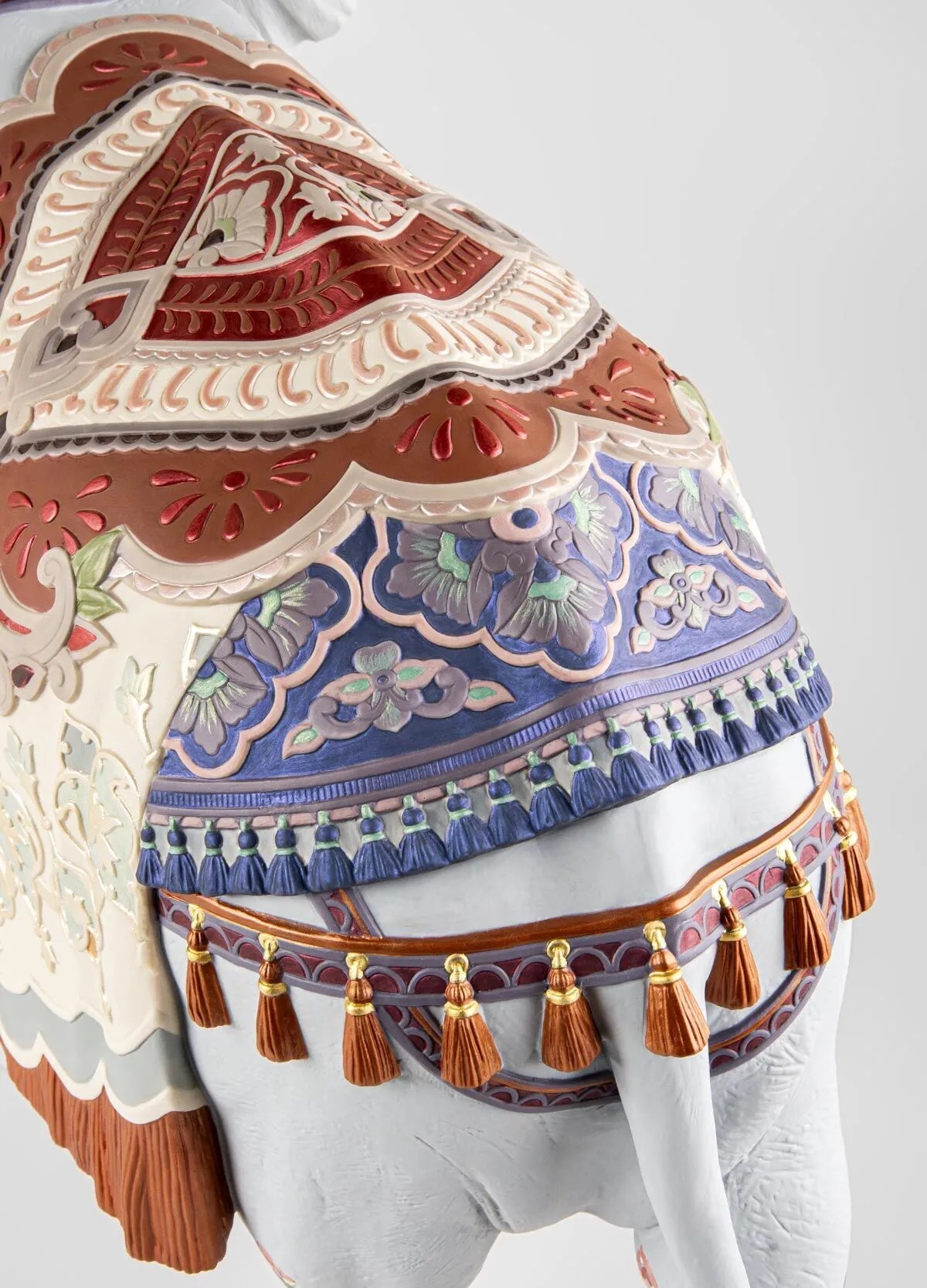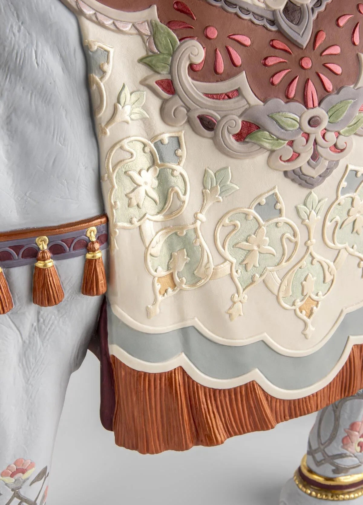 Цветовая гамма заслуживает особого внимания: 20 различных оттенков, нанесённых руками опытных мастеров с точностью, обогащают каждую поверхность уникальными нюансами. Оттенки оранжевого, кобальтово-синего, изумрудно-зелёного, лавандового и розового сочетаются с золотистым блеском и переливающейся отделкой, добавляя визуальное богатство. Среди ярких акцентов – оранжевые фарфоровые кисточки и гирлянды с золотыми колокольчиками, свисающие с шеи и боков слона, напоминающие о праздничных и церемониальных шествиях Южной Азии. Изящные цветочные гравюры на ногах слона продолжают орнаментальный язык, усиливая ощущение движения и гармонии.