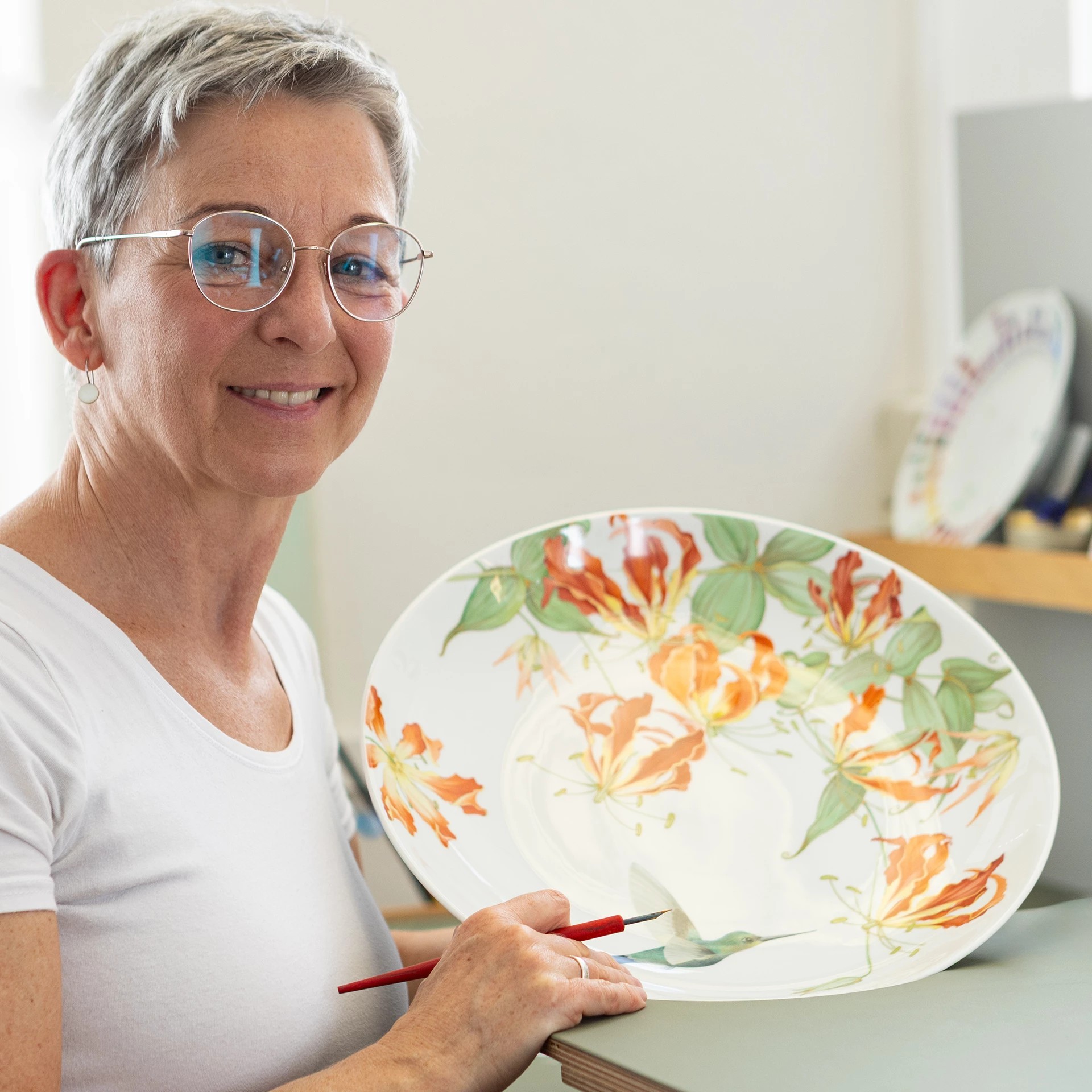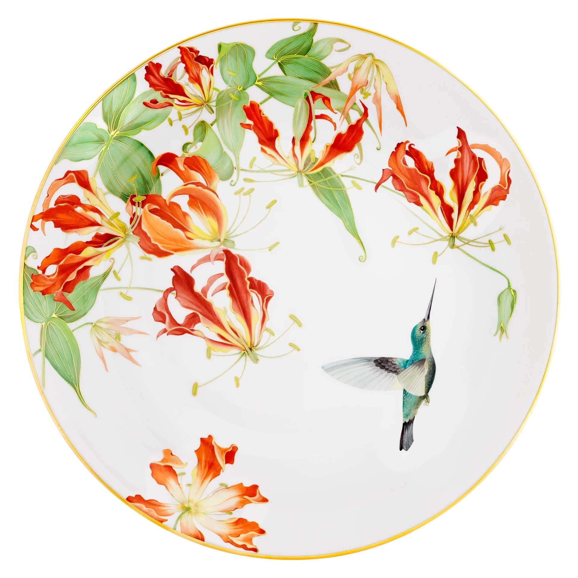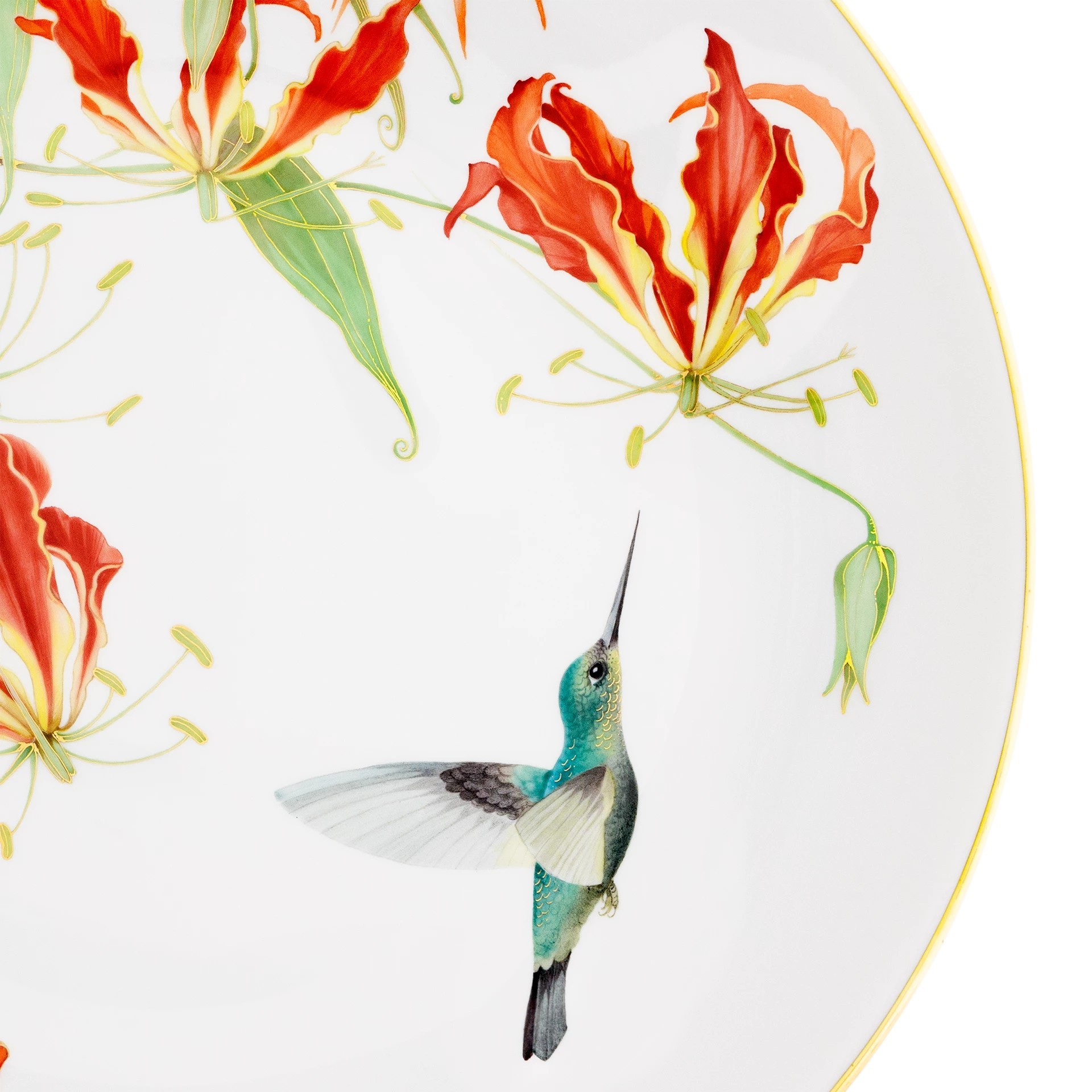 Художница Катрин Гецлафф сумела передать на белоснежном фарфоре как цветовую гамму, так и характерные черты и натуральность данной разновидности лилии. Пёстрая колибри подлетает к веточке глориозы, её маленькое тельце словно невесомо парит вдали от благоухающих цветов. Картина на тарелке написана в традиционном стиле, но данное произведение искусства прекрасно впишется и в современный интерьер. Изящный золотой ободок и позолоченные акценты в росписи украшают элегантное блюдо, не умаляя его лёгкости. Уже более трёх веков мануфактура глубоко запечатлевает красоту природы, зорко подмечая всё самое важное и яркое. Будь то цветы, птицы или насекомые, Мейсен — непревзойдённый мастер превращать природу в произведения искусства, обладающие непреходящей привлекательностью.