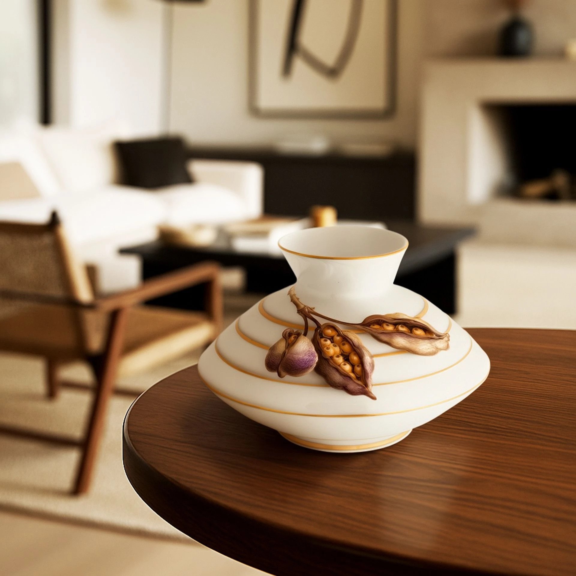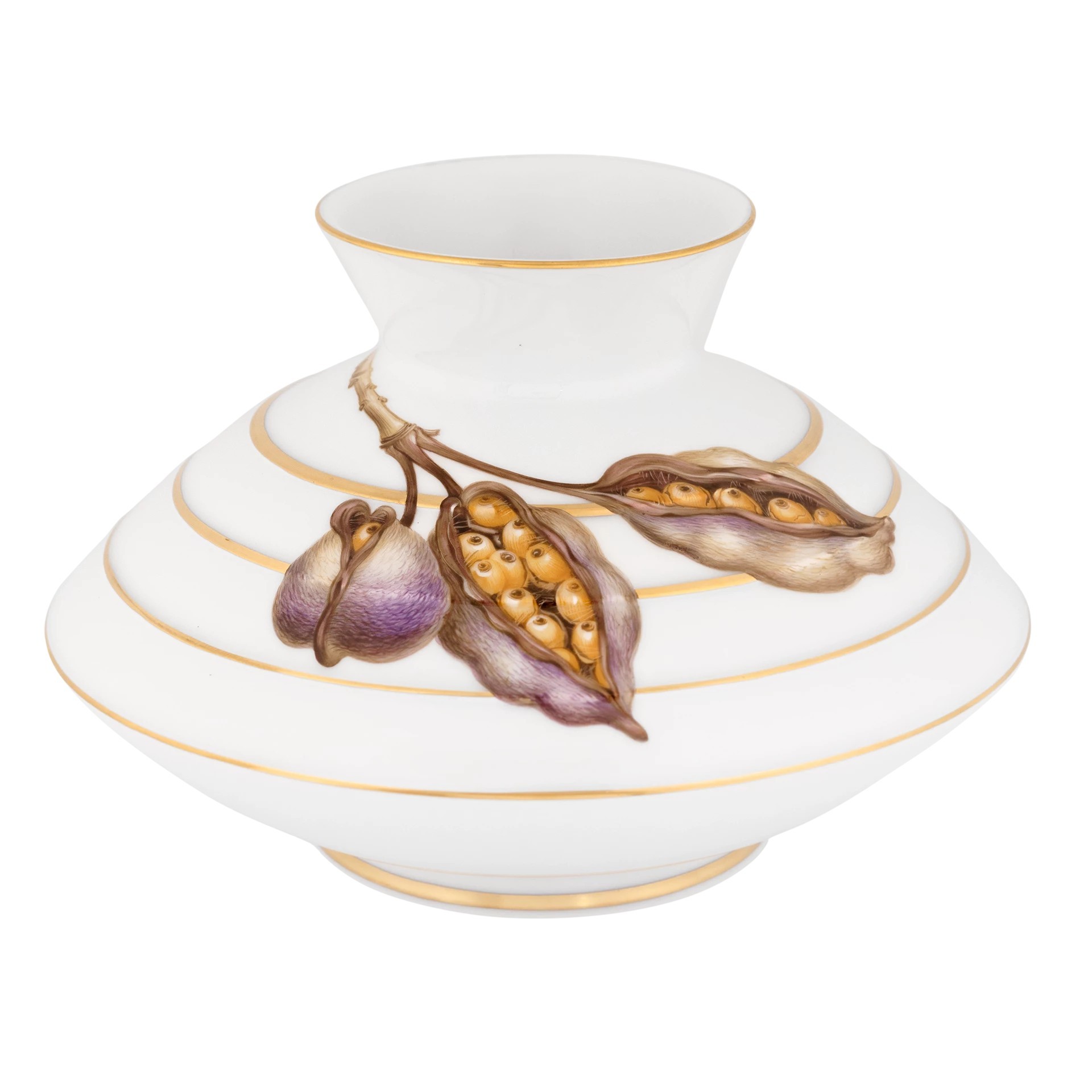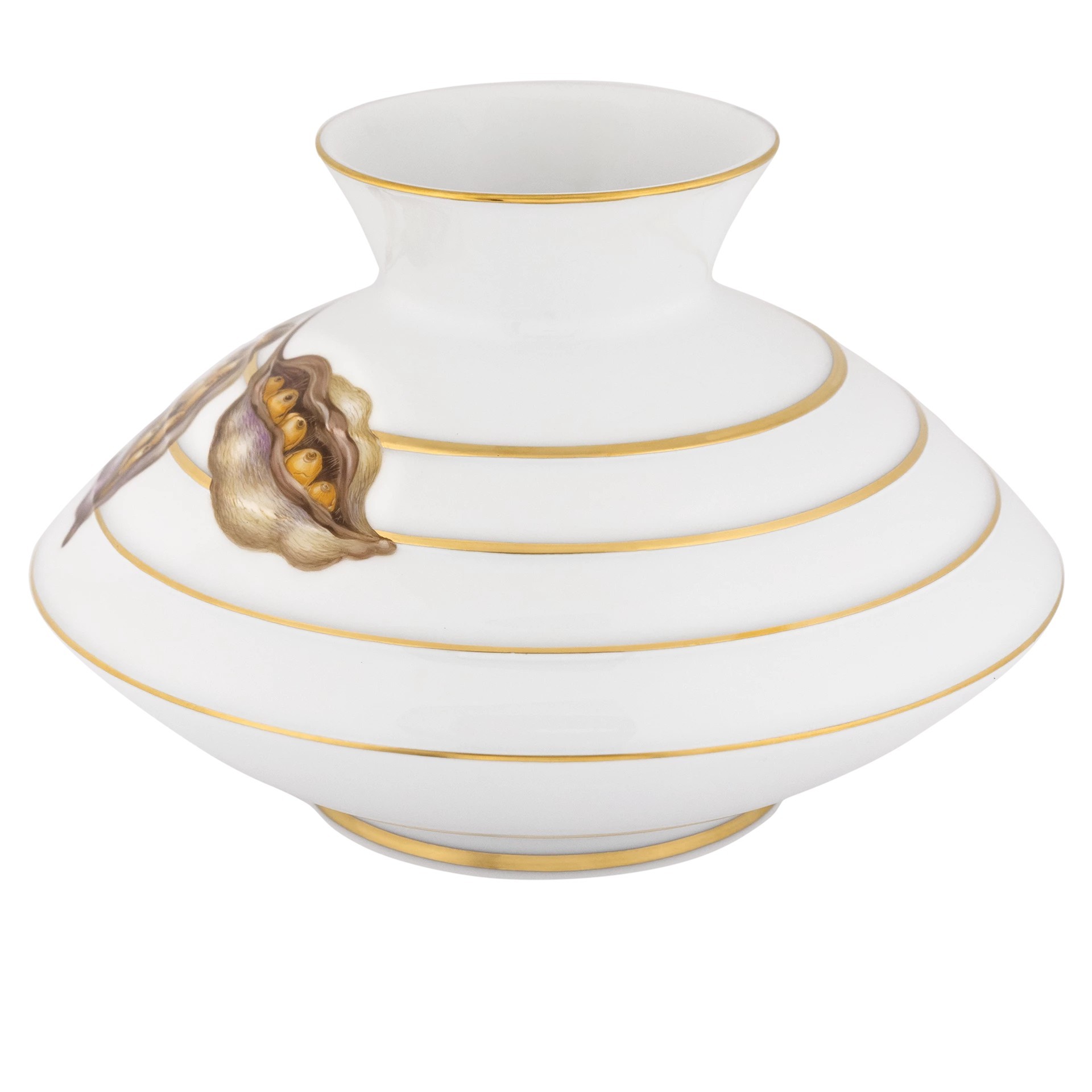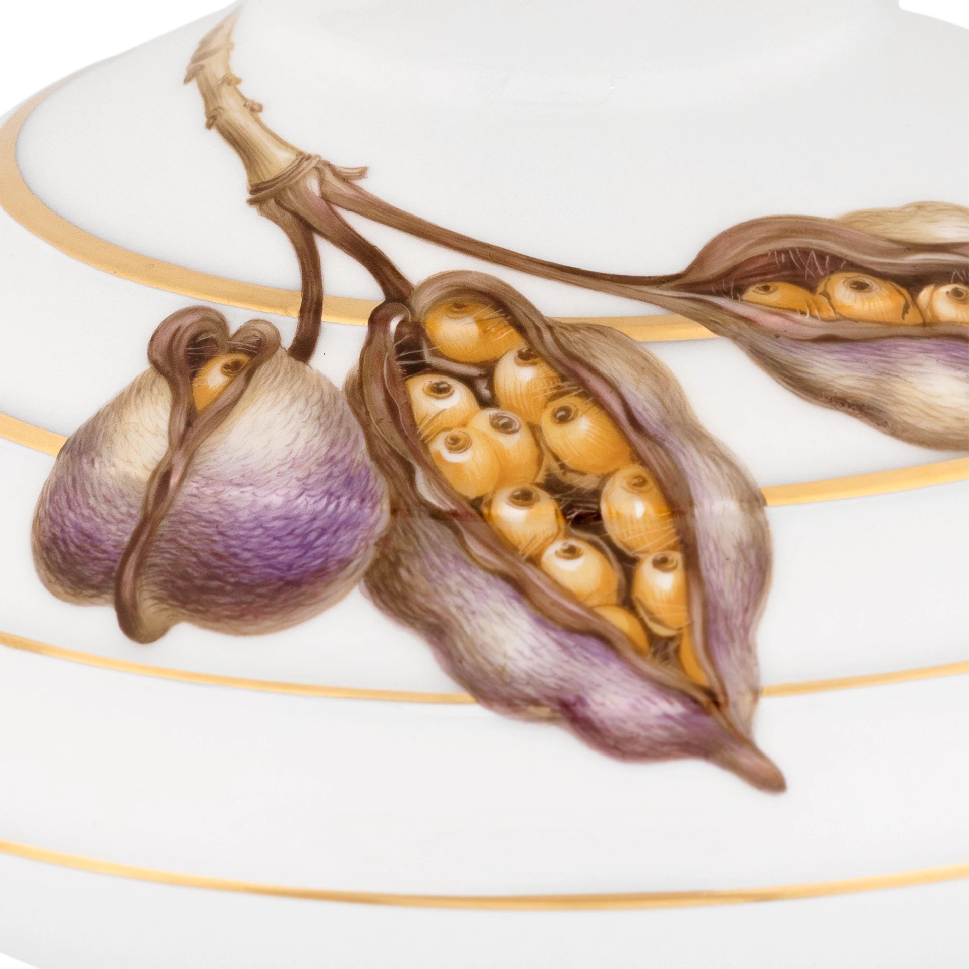 Художница по фарфору Виктория Шмидт воссоздаёт мельчайшие детали этих необыкновенных плодов в изумительно натуралистической манере. Коричневая веточка обвивает горлышко вазы и раскрывает перед вами удивительные плоды в виде раскрытых коробочек с хорошо защищёнными в них семенами. Смелые, но гармоничные сочетания оттенков коричневого, фиолетово-пурпурного и жёлтого в полной мере подчёркивают текстуру данного растения. Роскошные золотые полосы подчёркивают форму вазы и её рельеф, элегантно контрастируя с землистыми оттенками главного мотива. В результате получается удивительная декоративная схема, сочетающая ботанические натуралистические иллюстрации и художественную стилизацию, широко распространённую в Мейсене в конце XIX – начале XX веков.