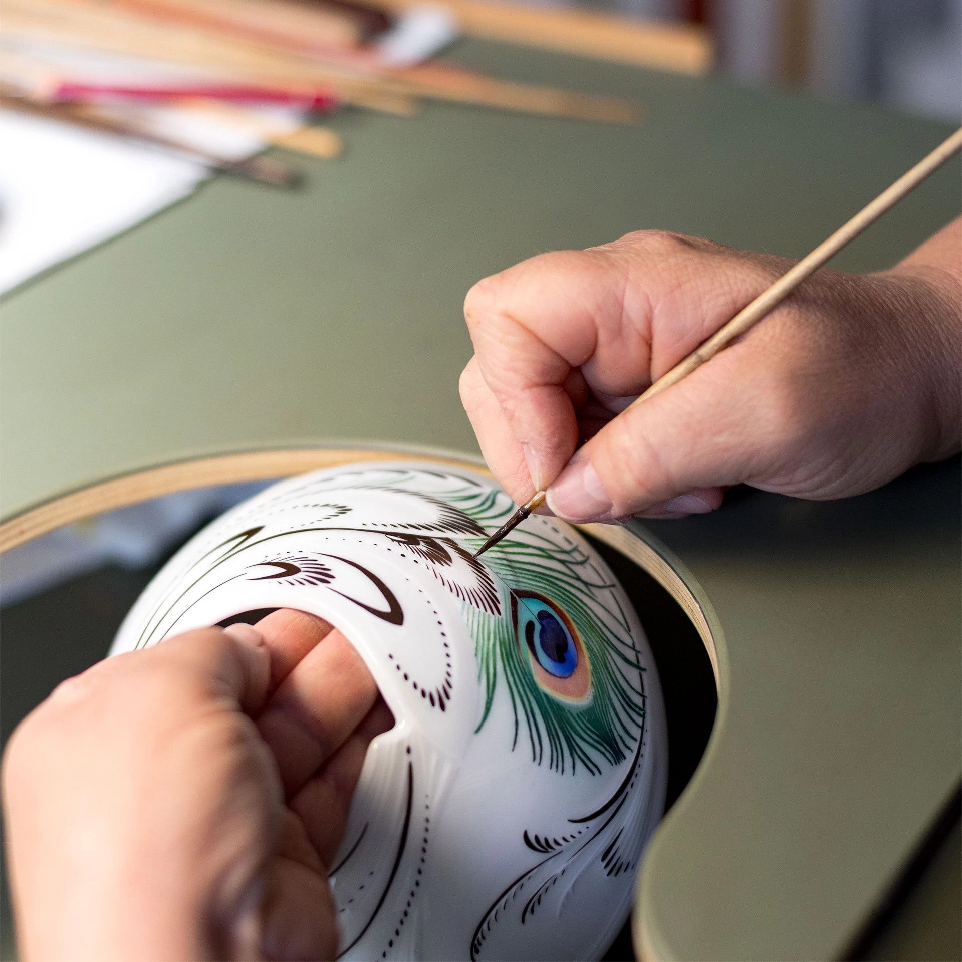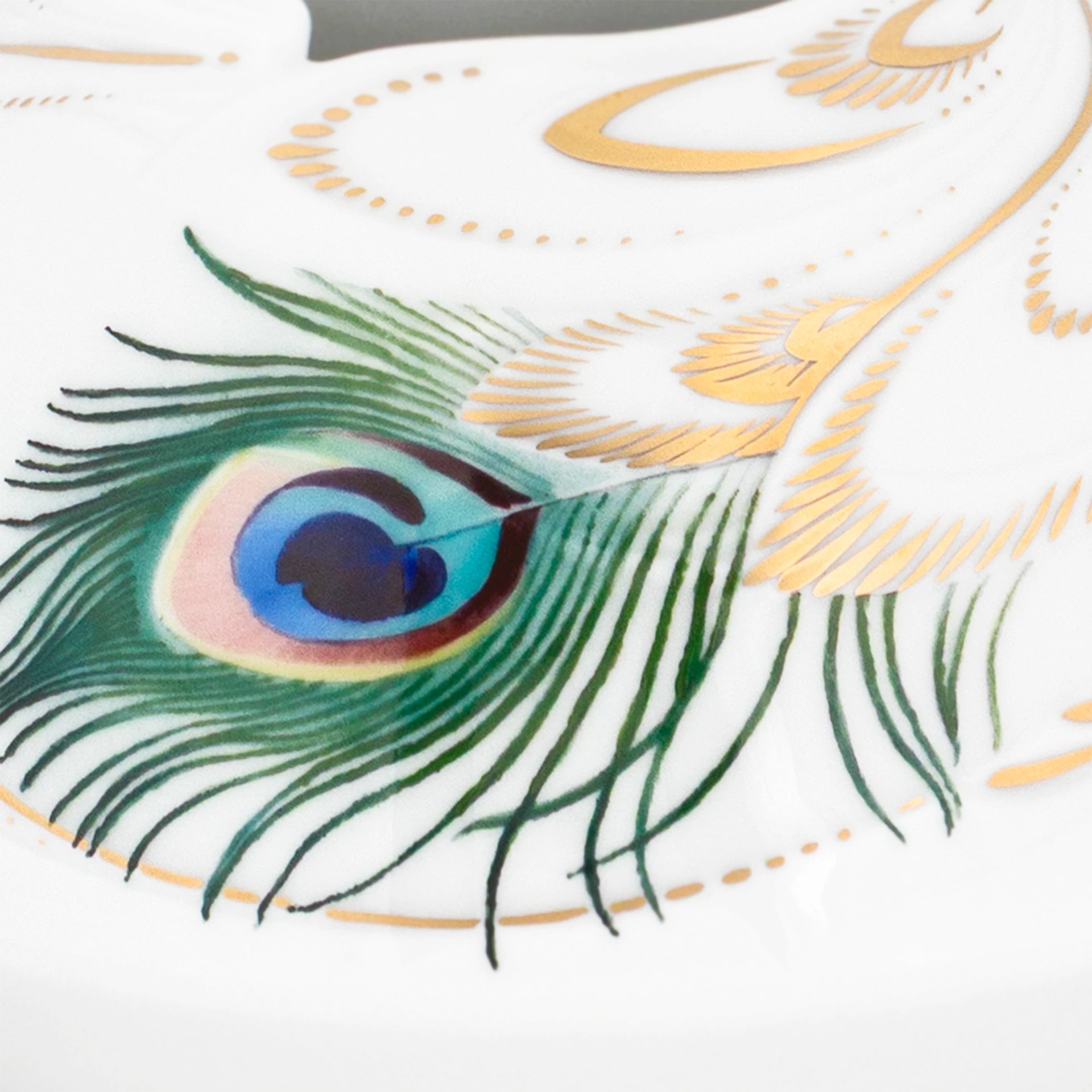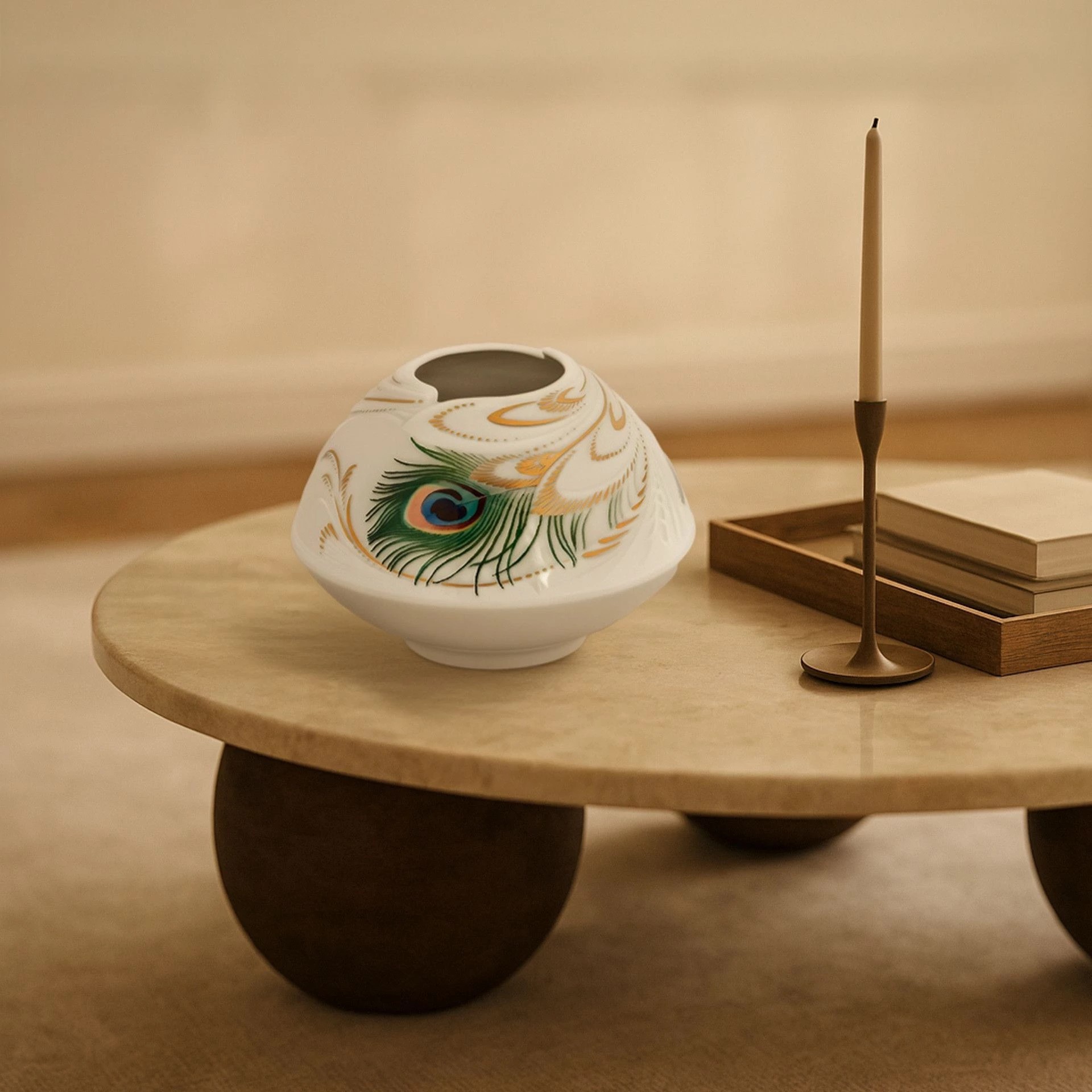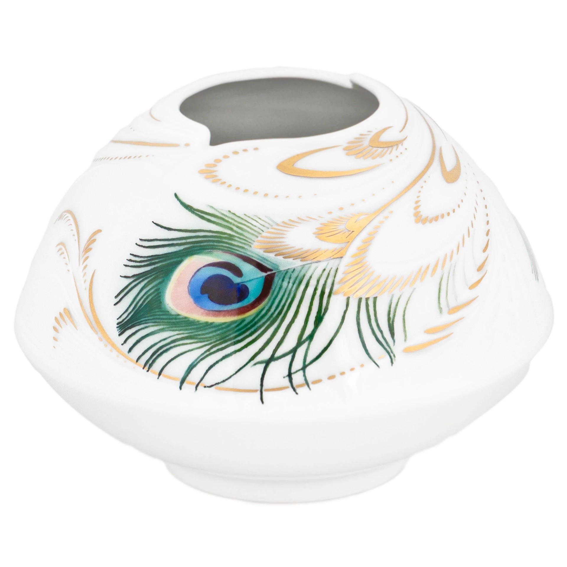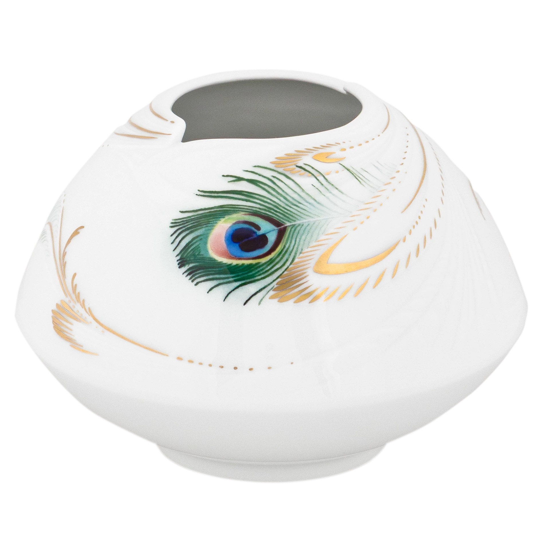 Небольшая ваза мейсенской художницы Сабины Вакс ранее была доступна только в белом цвете и поражает тонкими деталями, такими как полукруглая форма, неглубокий рельефный рисунок и необычное отверстие горлышка. Рисунок художницы по фарфору Виктории Шмидт перекликается с динамичной формой вазы: её впечатляющее павлинье перо обвивает её круглую поверхность. Рельеф подчёркивается отдельными штрихами позолоты.